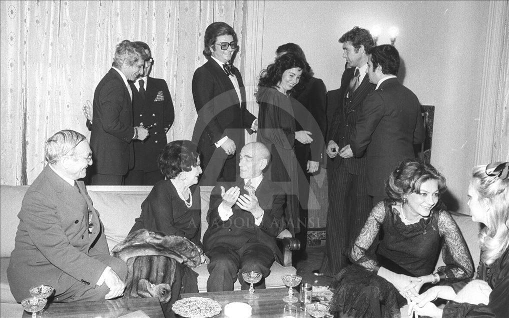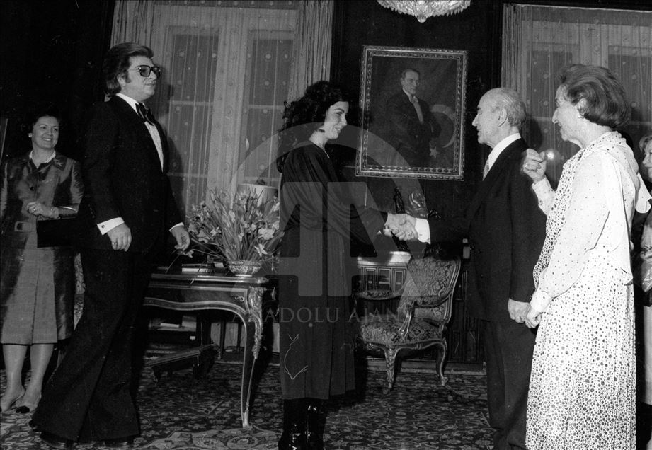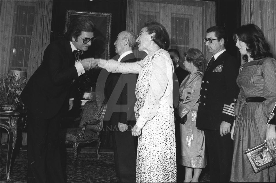 Türkiye'nin "Sanat Güneşi" olarak anılan sanatçı Zeki Müren, vefatının 23. yılında yad ediliyor. 14 Şubat 1978'de Cumhurbaşkanı Fahri Korutürk ve eşi Emek Korutürk, gazeteciler ve sanatçılar için Çankaya Köşkü'nde resepsiyon verdi. Resepsiyona ses sanatçısı Müren (solda) ve sinema sanatçısı Fatma Girik (ortada) katıldı. (Arşiv)