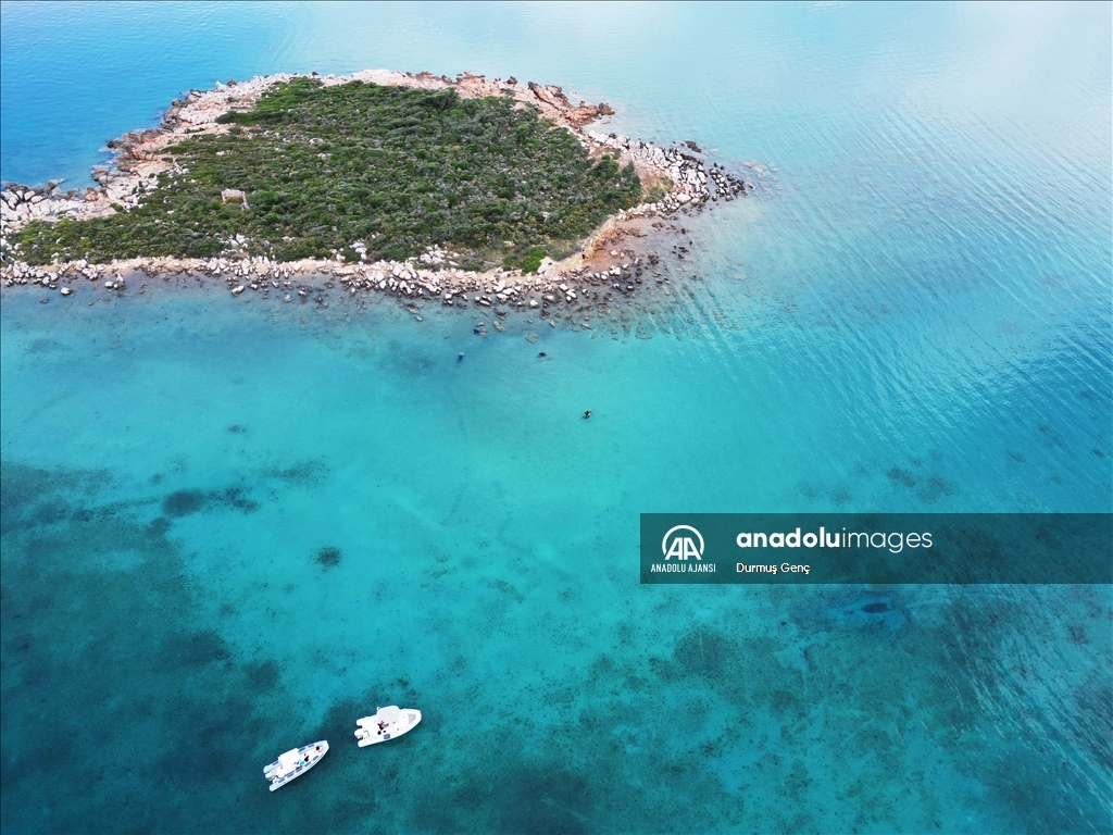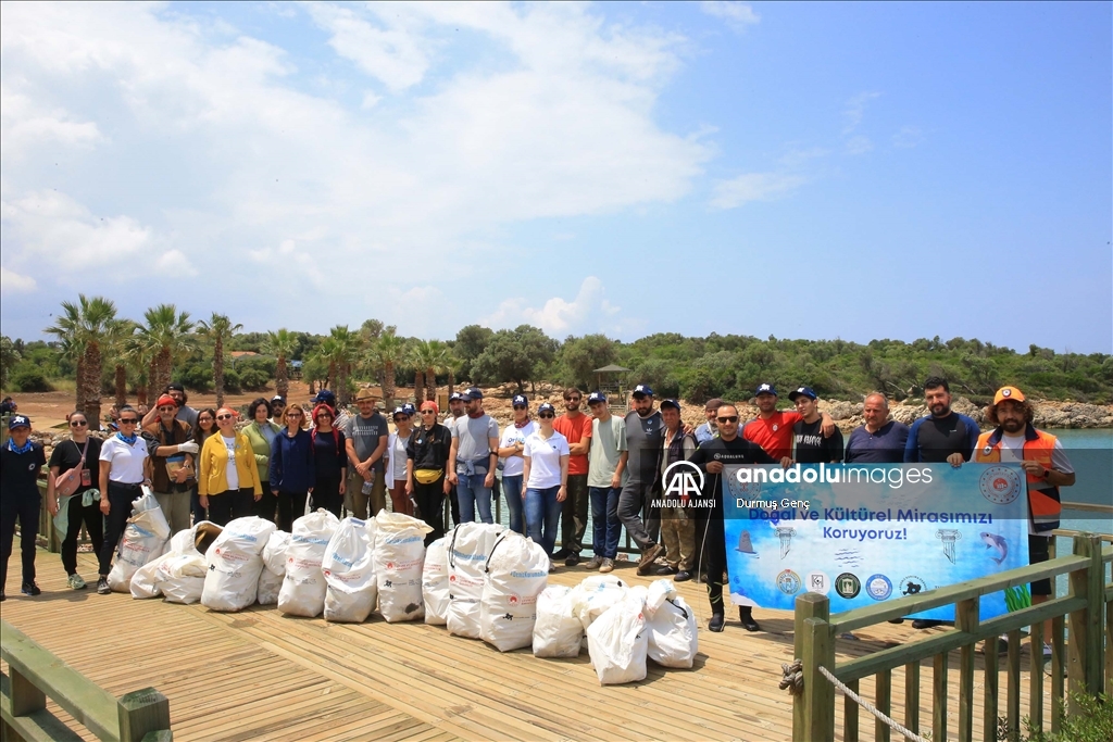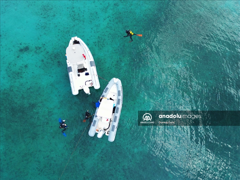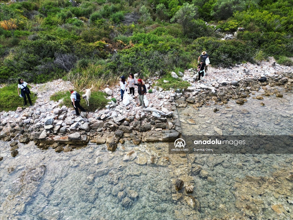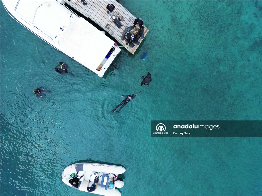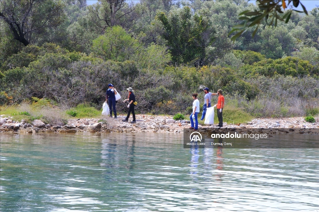 Koruma altında bulunan altın sarısı kumuyla ünlü Gökova Körfezi'ndeki Sedir Adası ile Kleopatra Plajı çevresinde ekipler tarafından kıyı ve deniz dibi temizliği gerçekleştirildi. ( Durmuş Genç - Anadolu Ajansı )Durmuş Genç