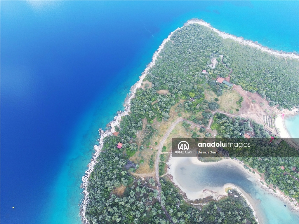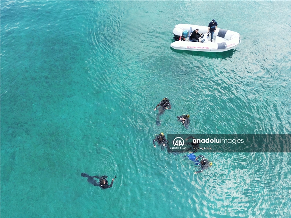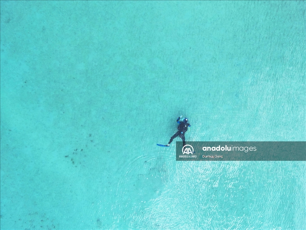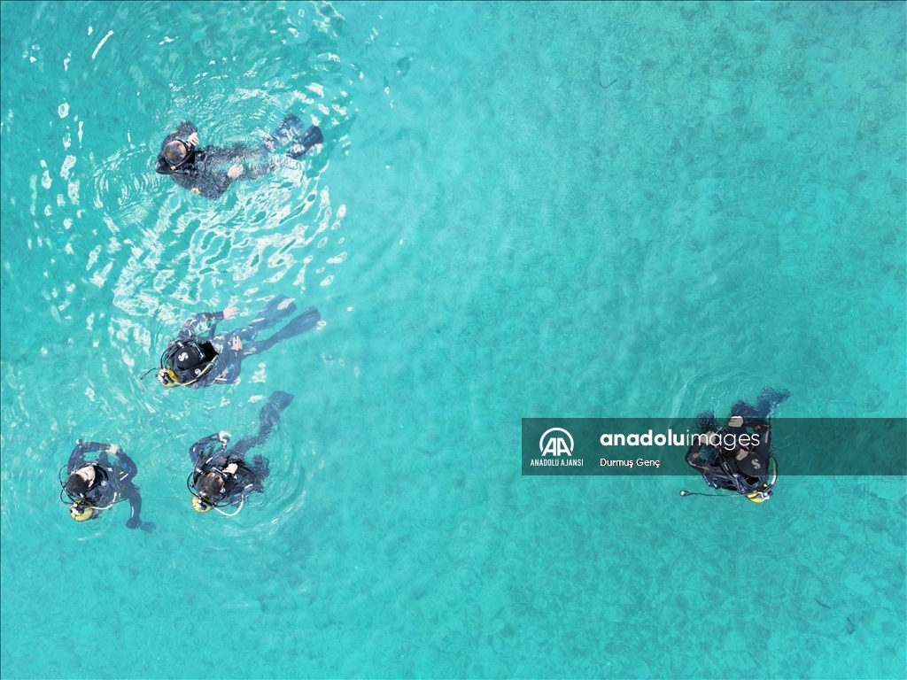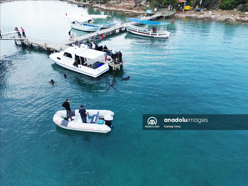 Koruma altında bulunan altın sarısı kumuyla ünlü Gökova Körfezi'ndeki Sedir Adası ile Kleopatra Plajı çevresinde ekipler tarafından kıyı ve deniz dibi temizliği gerçekleştirildi. ( Durmuş Genç - Anadolu Ajansı )Durmuş Genç