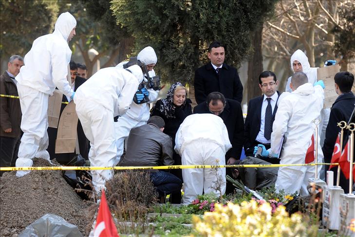 DIYARBAKIR CUMHURIYET BASSAVCILIGINCA YURUTULEN FAILI MECHUL CINAYETLERE ILISKIN SORUSTURMA KAPSAMINDA, YAZILAN TALIMAT UYARINCA, OTOPSI YAPILMASI AMACIYLA MEZARI ACILAN ESKI MARDIN JANDARMA ALAY KOMUTANI ALBAY RIDVAN OZDEN'IN ISKELETININ PARCALARI, DELIL TORBALARINA KONULARAK ADLI TIP KURUMU'NA GOTURULDU. OZEL YETKILI ISTANBUL CUMHURIYET SAVCISI HIKMET USTA (SAGDA) NEZARETINDE MEZARIN ACILMA ISLEMI SIRASINDA ALBAY OZDEN'IN ESI TOMRIS OZDEN DE YER ALDI. (ANADOLU AJANSI - BERK OZKAN) (20120221)