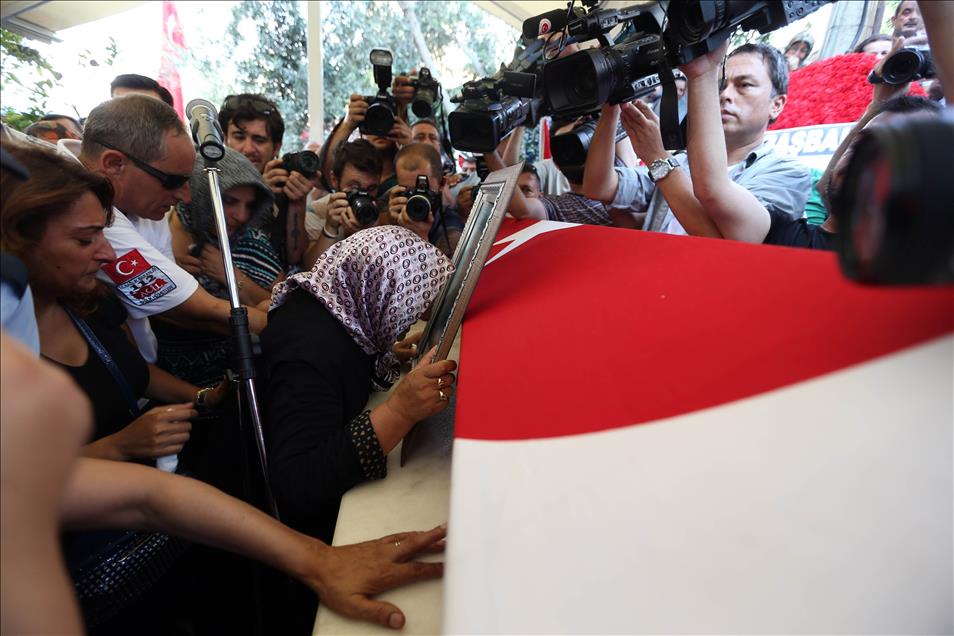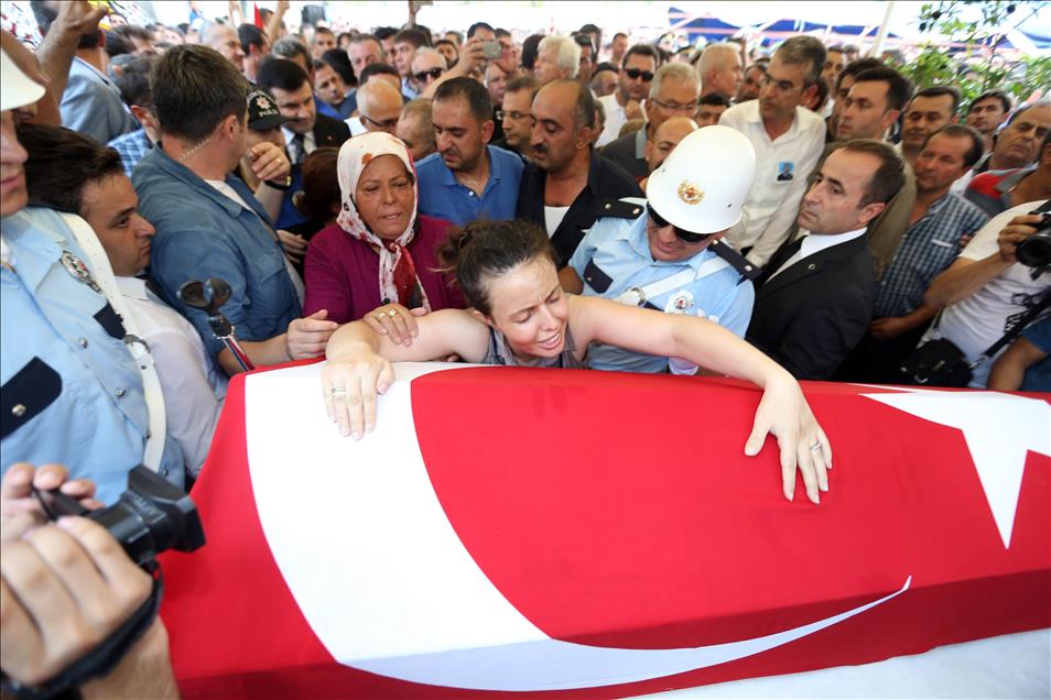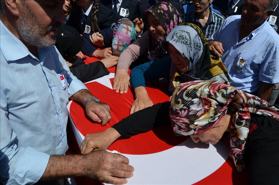 Mardin'in Midyat ilçesinde teröristlerin saldırısında şehit düşen polis memuru Abdullah Ümit Sercan, memleketi Alanya'da düzenlenen törenin ardından toprağa verildi. Şehidin eşi Özay Sercan (ortada) cenaze töreninde tabuta sarılarak gözyaşı döktü. (Sinan Özmüş - Anadolu Ajansı)Sinan Özmüş