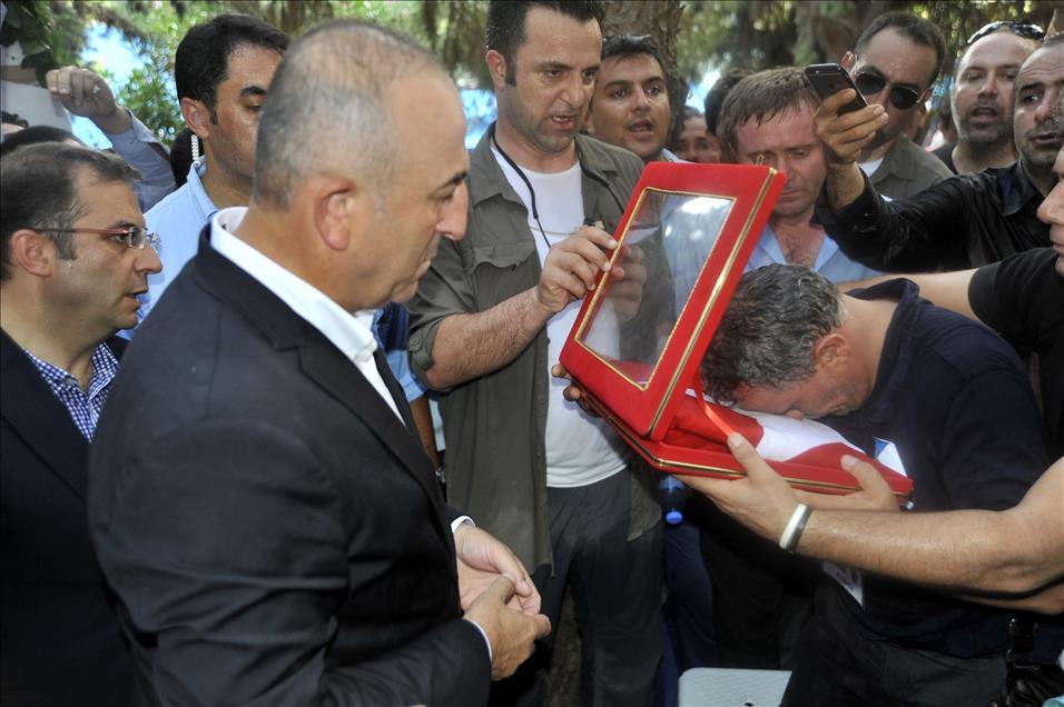 Mardin'in Midyat ilçesinde teröristlerin saldırısında şehit düşen polis memuru Abdullah Ümit Sercan, memleketi Alanya'da düzenlenen törenin ardından toprağa verildi. Dışişleri Başkanı Mevlüt Çavuşoğlu, şehidin tabutuna sarılı Türk Bayrağını, babası Durmuş Ali Sercan'a takdim etti. (Sinan Özmüş - Anadolu Ajansı)Sinan Özmüş