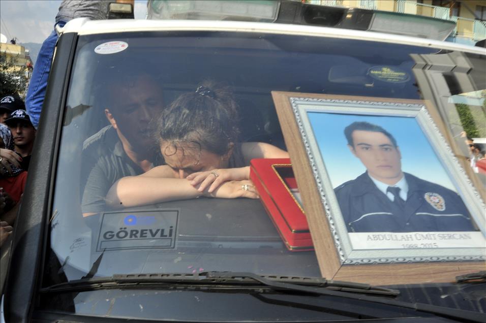 Mardin'in Midyat ilçesinde teröristlerin saldırısında şehit düşen polis memuru Abdullah Ümit Sercan, memleketi Alanya'da düzenlenen törenin ardından toprağa verildi. Şehidin cenazesini taşıyan araca şehidin eşi Özay Sercan da bindi. (Sinan Özmüş - Anadolu Ajansı)Sinan Özmüş