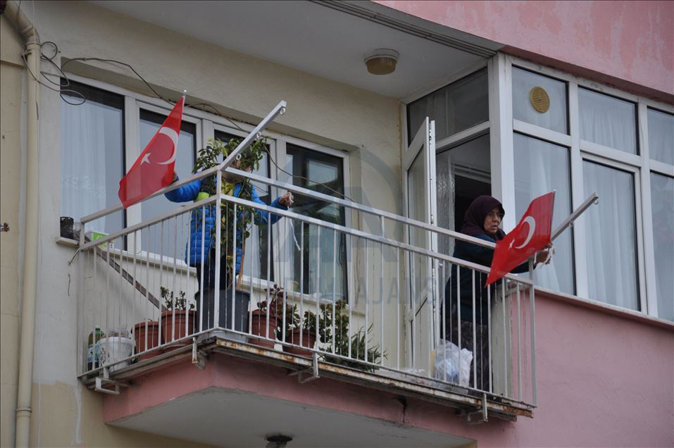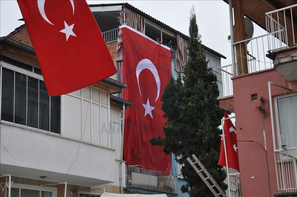 Suriye'nin İdlib bölgesinde Esed rejiminin hava saldırıları sonucu şehit olan Piyade Uzman Onbaşı Halil Çankaya Denizli'deki baba evine şehadet haberi ulaştı. Mahalledeki komşuları balkonlarına Türk bayrakları astı. ( Zekican Şenkaya - Anadolu Ajansı )Zekican Şenkaya