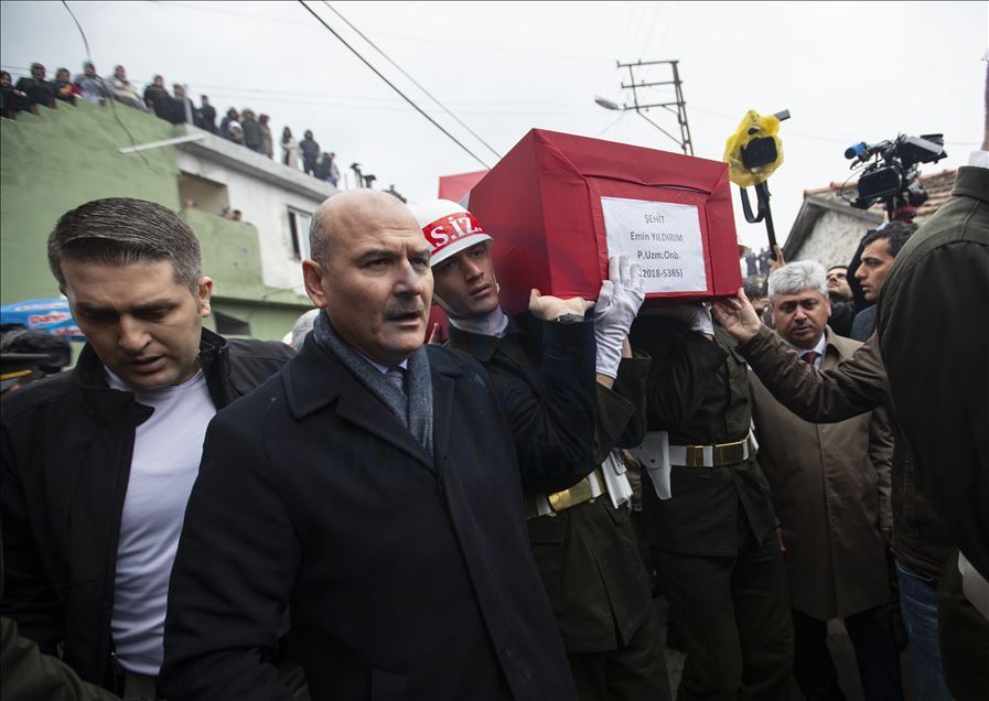 Suriye'nin İdlib kentinde Esed rejim unsurlarının hava saldırısı sonucu şehit olan Uzman Çavuş Emin Yıldırım, memleketi Hatay'da son yolculuğuna uğurlandı. Diyanet İşleri Başkanı Ali Erbaş'ın kıldırdığı cenaze törenine İçişleri Bakanı Süleyman Soylu da katıldı. ( Emin Sansar - Anadolu Ajansı )Emin Sansar