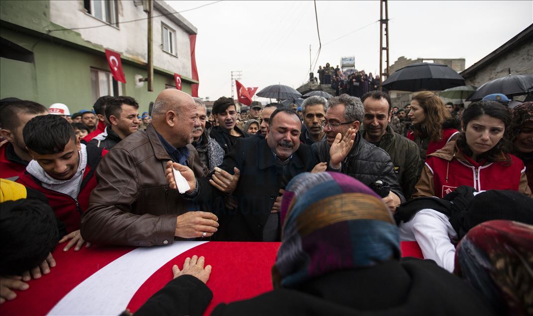 Suriye'nin İdlib kentinde Esed rejim unsurlarının hava saldırısı sonucu şehit olan Uzman Çavuş Emin Yıldırım, memleketi Hatay'da son yolculuğuna uğurlandı. Yağmurlu havaya rağmen çok sayıda vatandaşın katıldığı törende, şehit yakınları tabuta sarıldı. ( Emin Sansar - Anadolu Ajansı )Emin Sansar