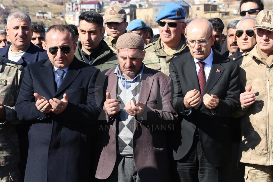Irak'ın kuzeyindeki Kani Rash bölgesinde Türk Silahlı Kuvvetleri (TSK) unsurlarına yönelik saldırıda şehit olan Piyade Sözleşmeli Er Hayrettin Dindar, Siirt'in Şirvan ilçesinde son yolculuğuna uğurlandı. Törene katılan Başbakan Yardımcısı Mehmet Şimşek (ortada), şehit babası Akif Dindar'a Türk bayrağı takdim etti. ( Fecri Barlık - Anadolu Ajansı )Fecri Barlık