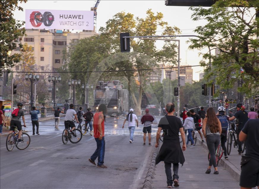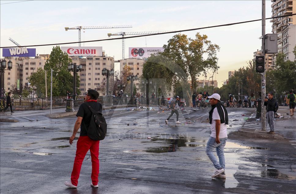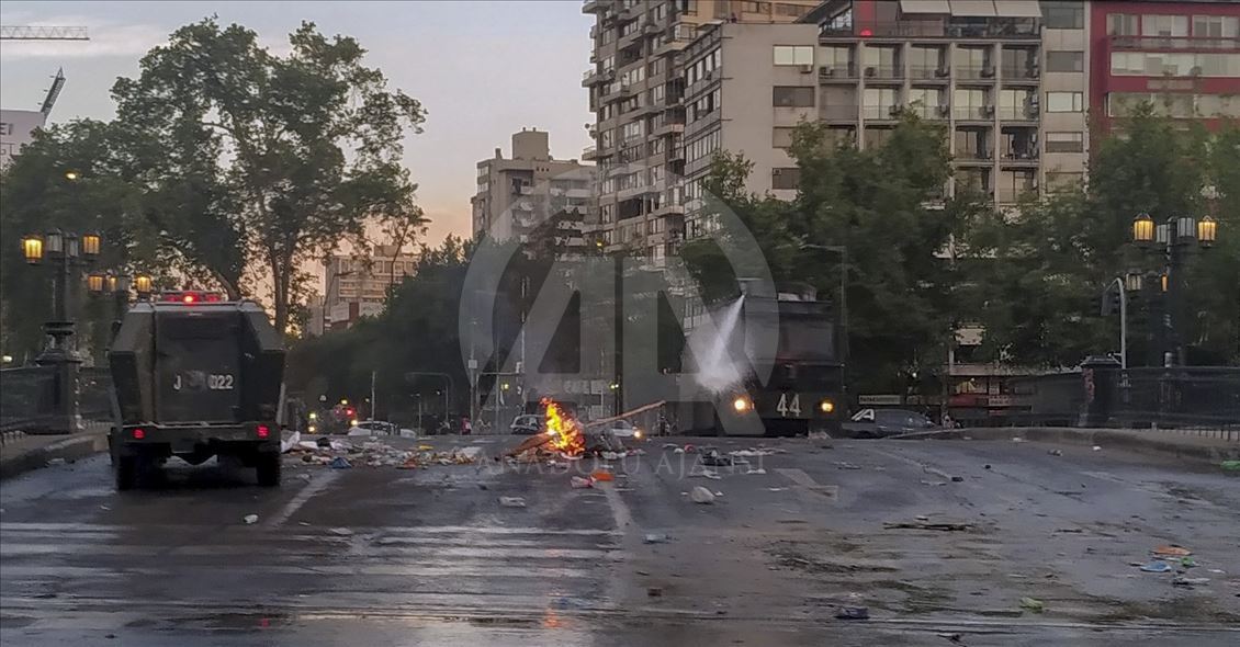 Geçen haftadan bu yana yağma ve yakma olaylarına neden olan şiddetli protestoların yaşandığı Şili'de, Devlet Başkanı Sebastian Pinera'nın, kabinesini değiştirmek üzere bütün bakanların istifasını istemesi üzerine gösterilere katılım azaldı. İtalya Meydanında, kendilerine taş ve sert cisimler atan göstericilere, güvenlik güçleri su ve biber gazı ile müdahale etti. ( Muhammed Emin Canik - Anadolu Ajansı )Muhammed Emin Canik
