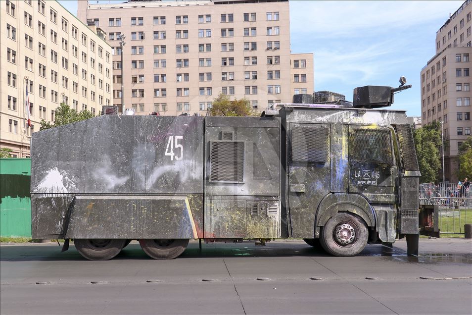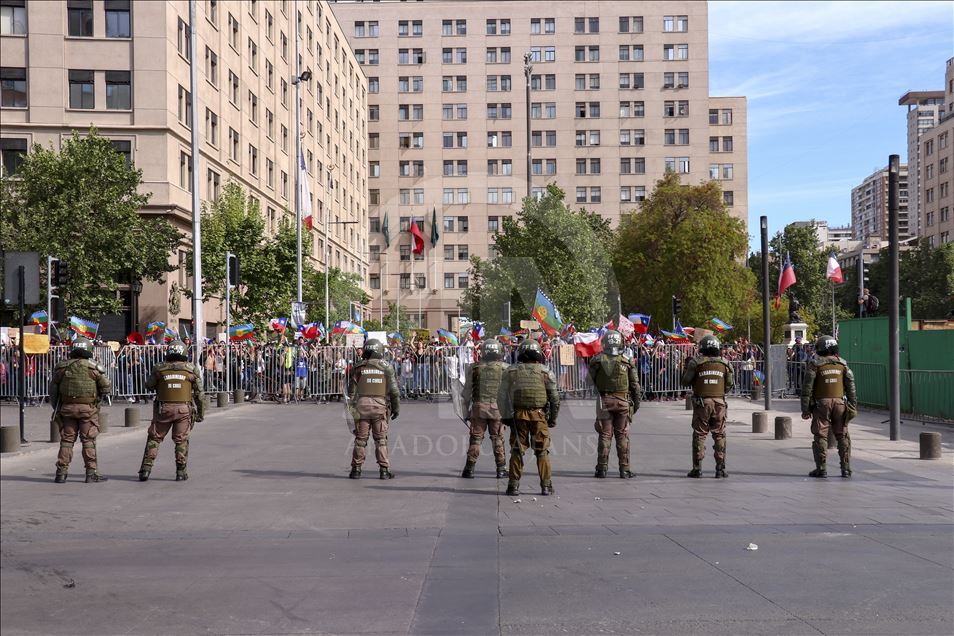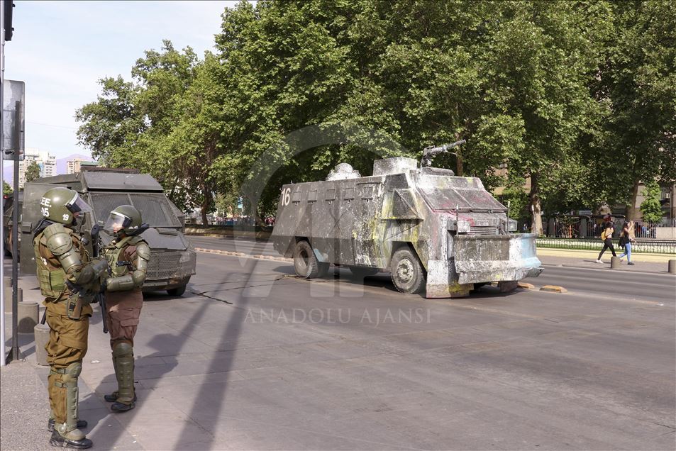 Geçen haftadan bu yana yağma ve yakma olaylarına neden olan şiddetli protestoların yaşandığı Şili'de, Devlet Başkanı Sebastian Pinera'nın, kabinesini değiştirmek üzere bütün bakanların istifasını istemesi üzerine gösterilere katılım azaldı. Bazı göstericiler öğlen saatlerinde Devlet Başkanlığı Sarayı La Moneda yakınında toplandı. Şili polisi tomalarla güvenlik önlemi aldı. ( Muhammed Emin Canik - Anadolu Ajansı )Muhammed Emin Canik