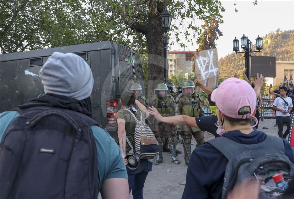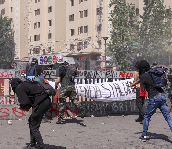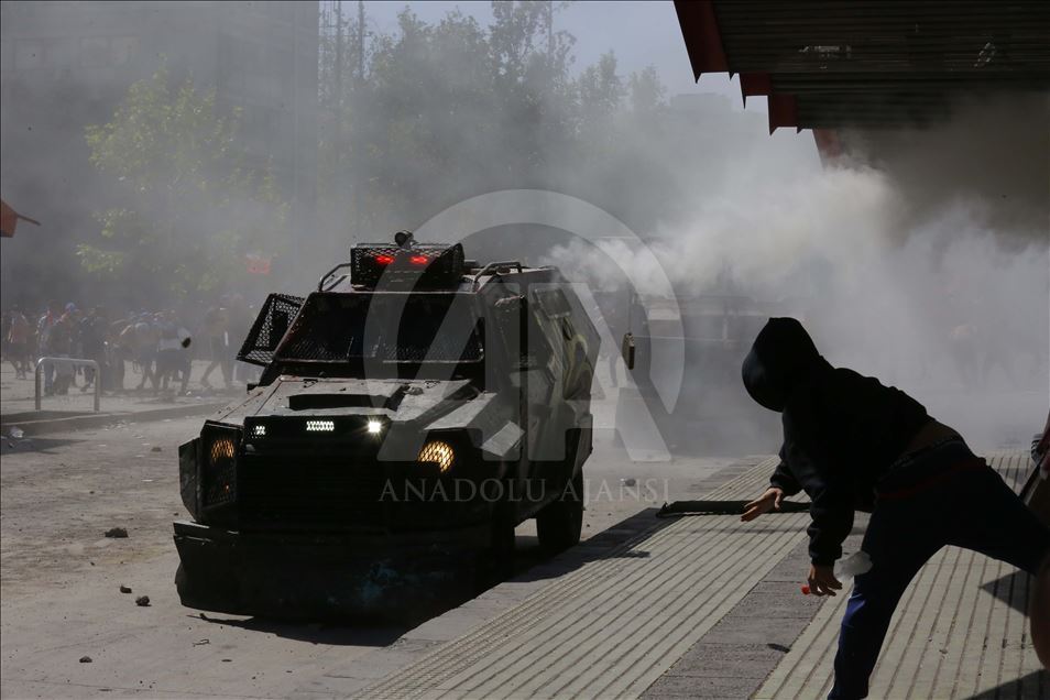 Şili'de metro ücretine yapılan zammın ardından başlayan ve geçen hafta şiddetlenerek 18 kişinin ölümüne neden protestolar sürüyor. Protestoda, bazı göstericiler güvenlik güçlerine yerden söktükleri kaldırım taşlarını atarken, polis de göz yaşartıcı gaz ve biber gazı ile göstericilere müdahale etti. ( Muhammed Emin Canik - Anadolu Ajansı )Muhammed Emin Canik