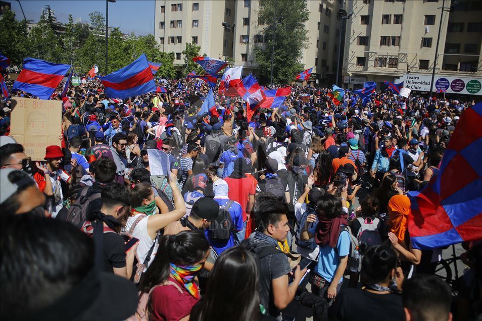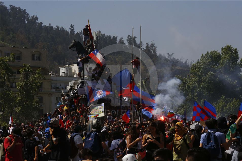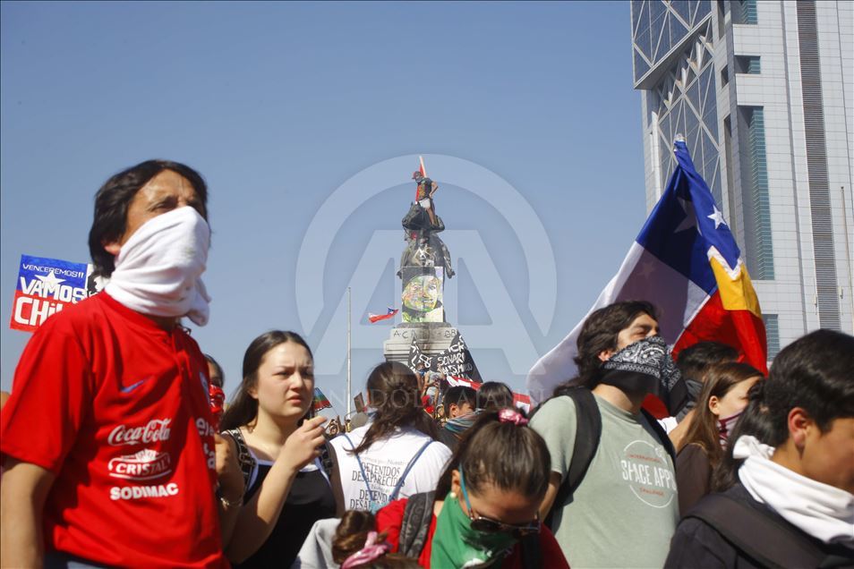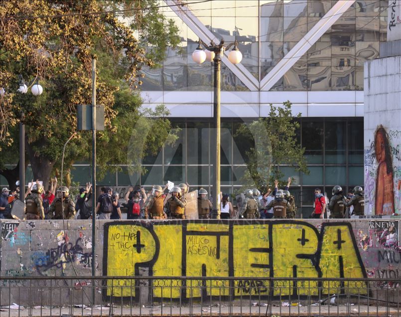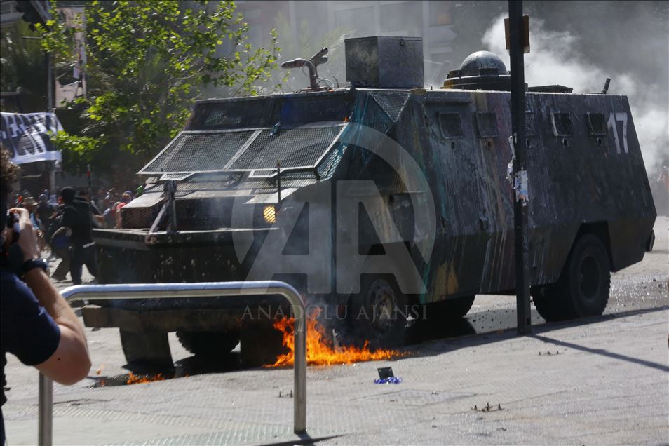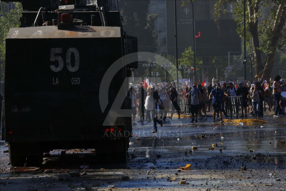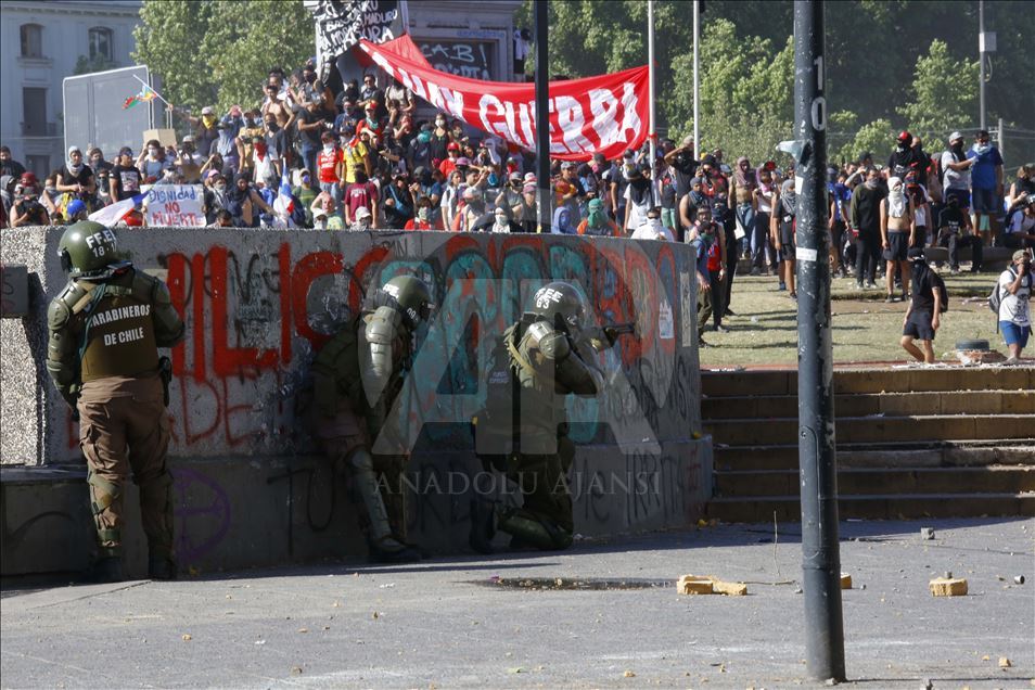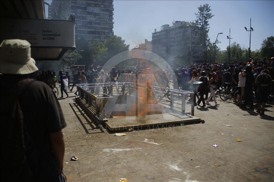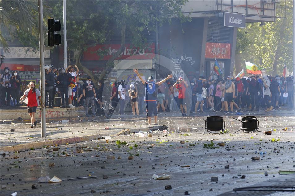 Şili'de metro ücretine yapılan zamlara karşı başlatılan, şiddet olaylarına dönüştükten sonra ülke çapında yayılan protestolar devam ederken, gösteriler nedeniyle hayatını kaybedenlerin sayısı 18'e yükseldi. Başkent Santiago'daki İtalya Meydanı olarak bilinen Baquedano Meydanında toplanan binlerce kişi Devlet Başkanı Sebastian Pinera hükümetini protesto etti. Bazı göstericiler güvenlik güçleri taş ve sert cisimler fırlattı. ( Muhammed Emin Canik - Anadolu Ajansı )Muhammed Emin Canik