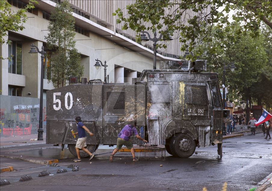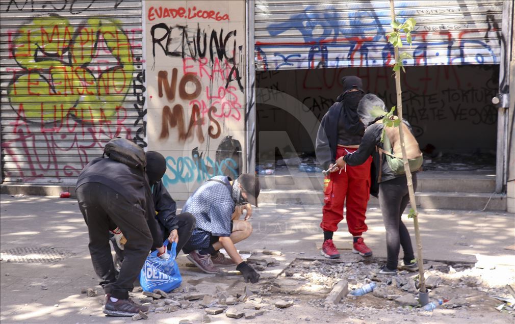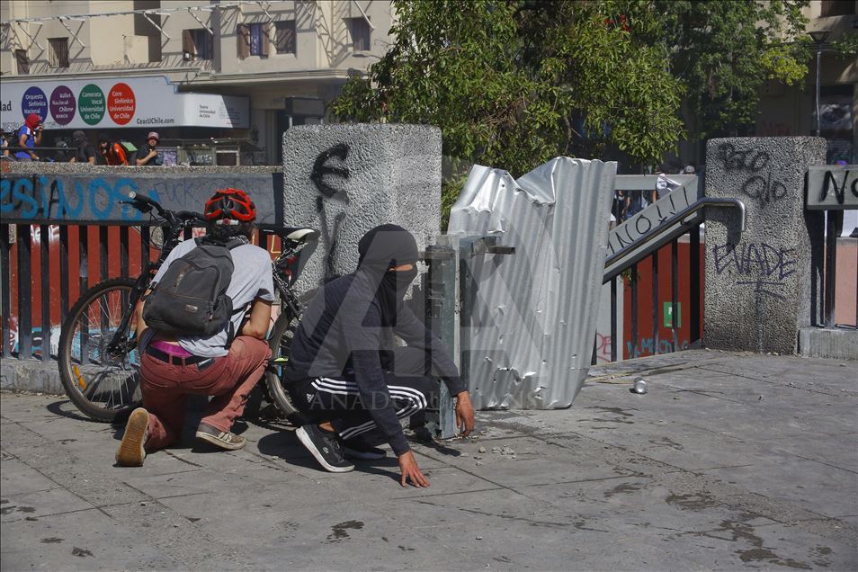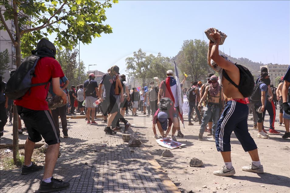 Şili'de metro ücretine yapılan zamlara karşı başlatılan, şiddet olaylarına dönüştükten sonra ülke çapında yayılan protestolar devam ederken, gösteriler nedeniyle hayatını kaybedenlerin sayısı 18'e yükseldi. Başkent Santiago'daki İtalya Meydanı olarak bilinen Baquedano Meydanında toplanan binlerce kişi Devlet Başkanı Sebastian Pinera hükümetini protesto etti. Bazı göstericiler güvenlik güçlerine karşı kullanmak için kaldırım taşlarını parçaladı. ( Muhammed Emin Canik - Anadolu Ajansı )Muhammed Emin Canik