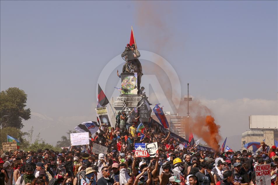 Şili'de metro ücretine yapılan zamlara karşı başlatılan, şiddet olaylarına dönüştükten sonra ülke çapında yayılan protestolar devam ederken, gösteriler nedeniyle hayatını kaybedenlerin sayısı 18'e yükseldi. Başkent Santiago'daki İtalya Meydanı olarak bilinen Baquedano Meydanında toplanan binlerce kişi Devlet Başkanı Sebastian Pinera hükümetini protesto etti. ( Muhammed Emin Canik - Anadolu Ajansı )Muhammed Emin Canik
