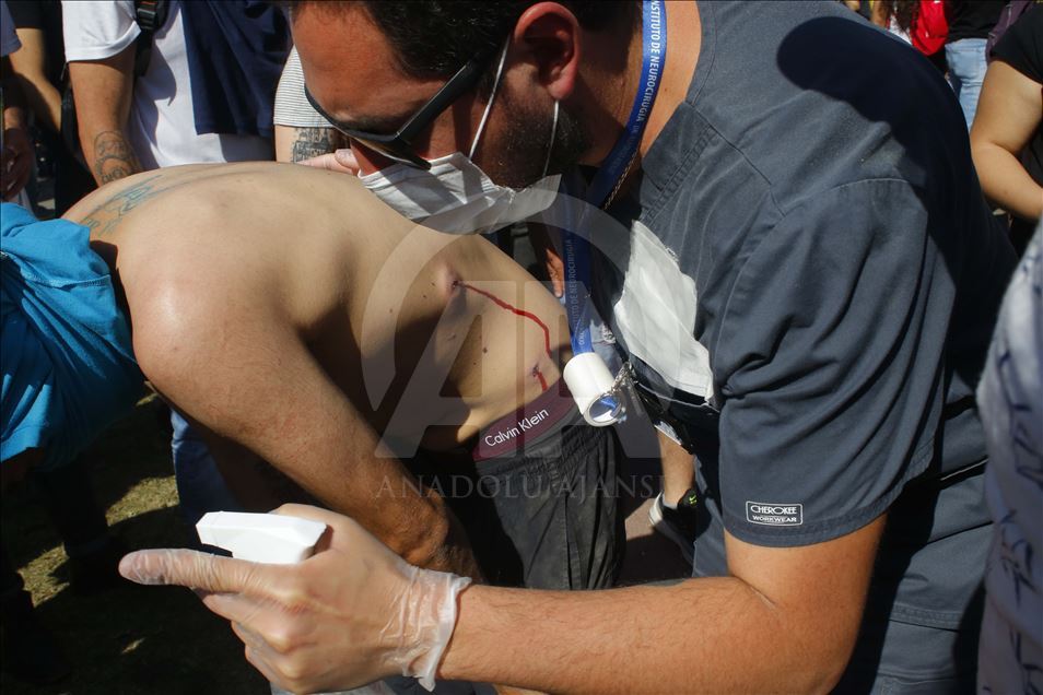 Şili'de metro ücretine yapılan zammın ardından başlayan ve geçen hafta şiddetlenerek 18 kişinin ölümüne neden protestolar sürüyor. Başkent Santiago'da binlerce kişi, İtalya Meydanı olarak bilinen Baquedano Meydanı'nda Devlet Başkanı Sebastian Pinera hükümeti karşıtı gösterilerini devam ediyor. Güvenlik güçlerinin gösteriye müdahale etmesi sonucu bir gösterici yaralandı. ( Sebastian Brogca - Anadolu Ajansı )Sebastian Brogca