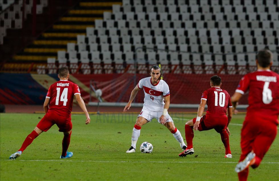 A Milli Futbol Takımı, UEFA Uluslar B Ligi, 3. Grup ikinci maçında Belgrad’ın Rajko Mitic Stadı’nda Sırbistan ile karşılaştı. Bir pozisyonda milli oyuncu Çağlar Söyüncü (4) rakipleriyle mücadele etti. ( Mustafa Öztürk - Anadolu Ajansı )Mustafa Öztürk