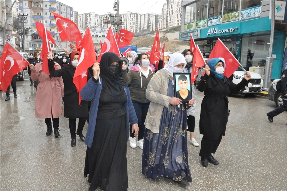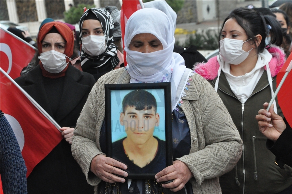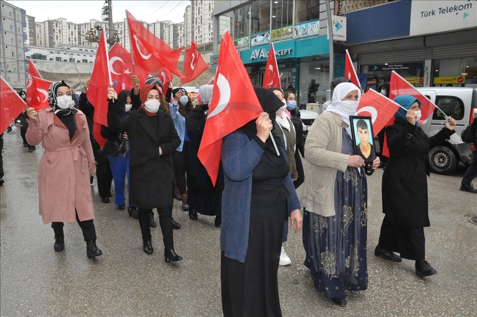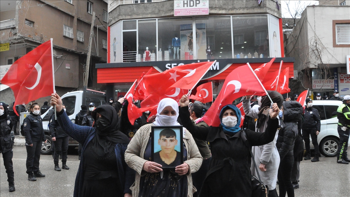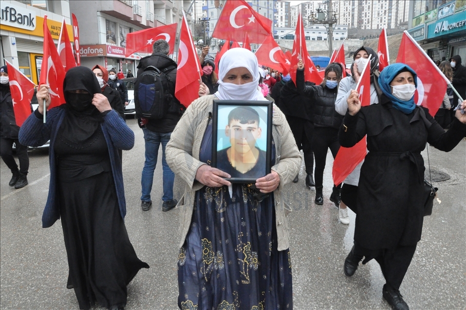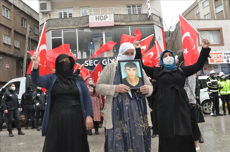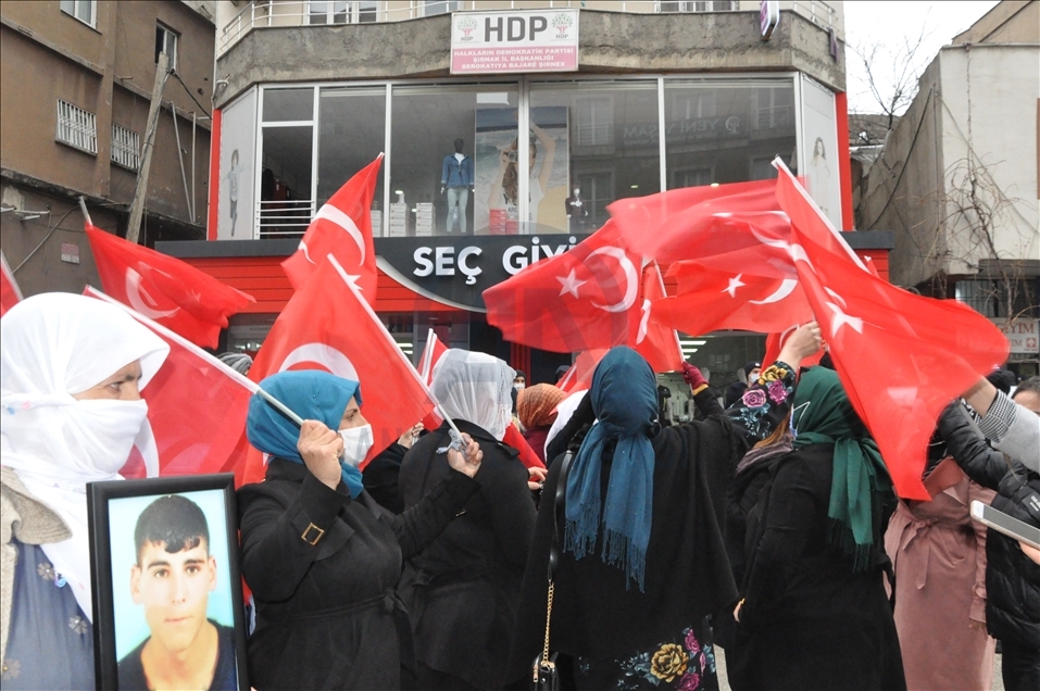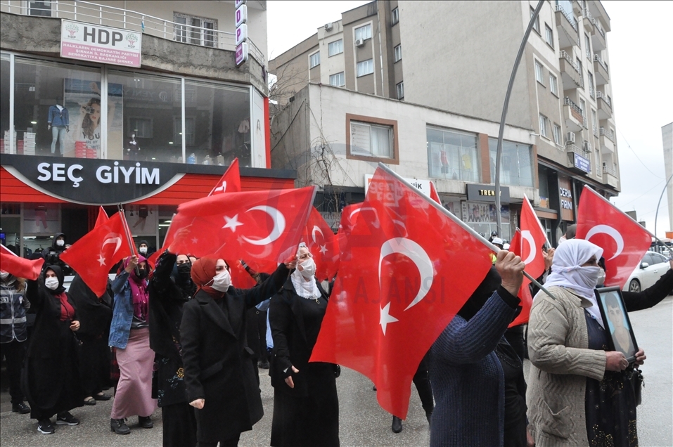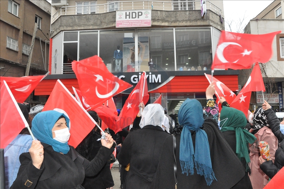 PKK'lı teröristlerce çocukları dağa kaçırılan, yakınlarını terör saldırılarında kaybeden Şırnaklı kadınlar ile şehit ve gazi aileleri, Şehit Üsteğmen Mehmet Esin Caddesi'nde gerçekleştirdikleri yürüyüşün ardından HDP İl Başkanlığı önüne geldi. ( Faruk Küçük - Anadolu Ajansı )Faruk Küçük