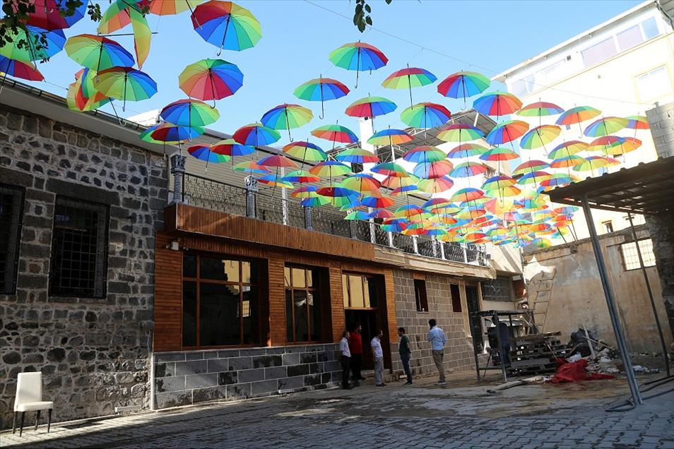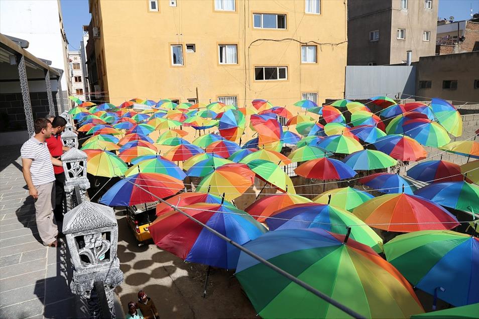 Diyarbakır'da bir işletmeci iş yerinin bulunduğu sokağı farklı renklerdeki 400 şemsiye ile süsledi. İki bina arasındaki iplere yerleştirilen şemsiyelerle oluşturulan görüntü, esnaf ve vatandaşların yanı sıra kenti ziyaret eden turistlerin de ilgisini çekiyor (GANİ CİHAN ESER - Anadolu Ajansı)GANİ CİHAN ESER