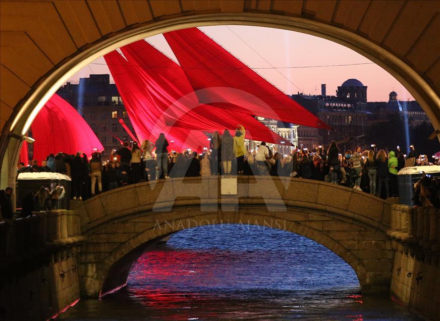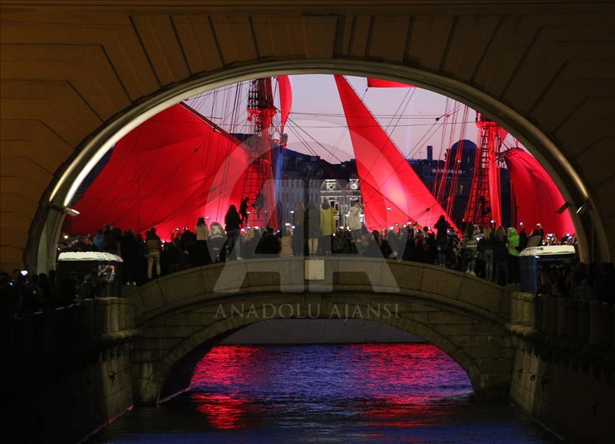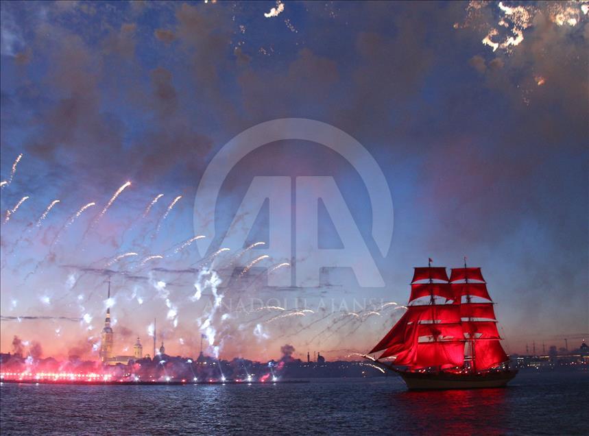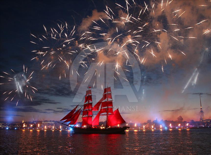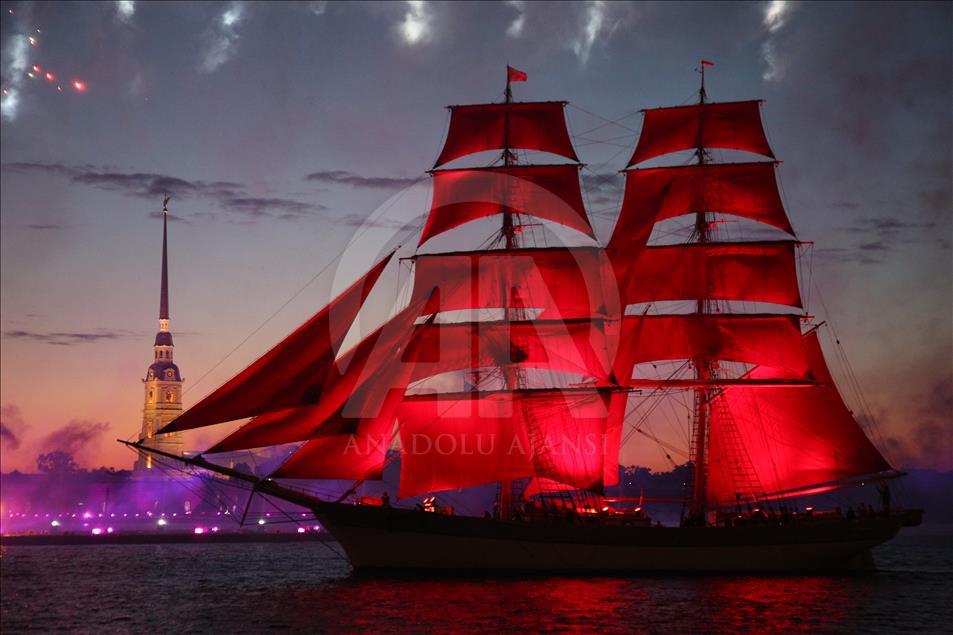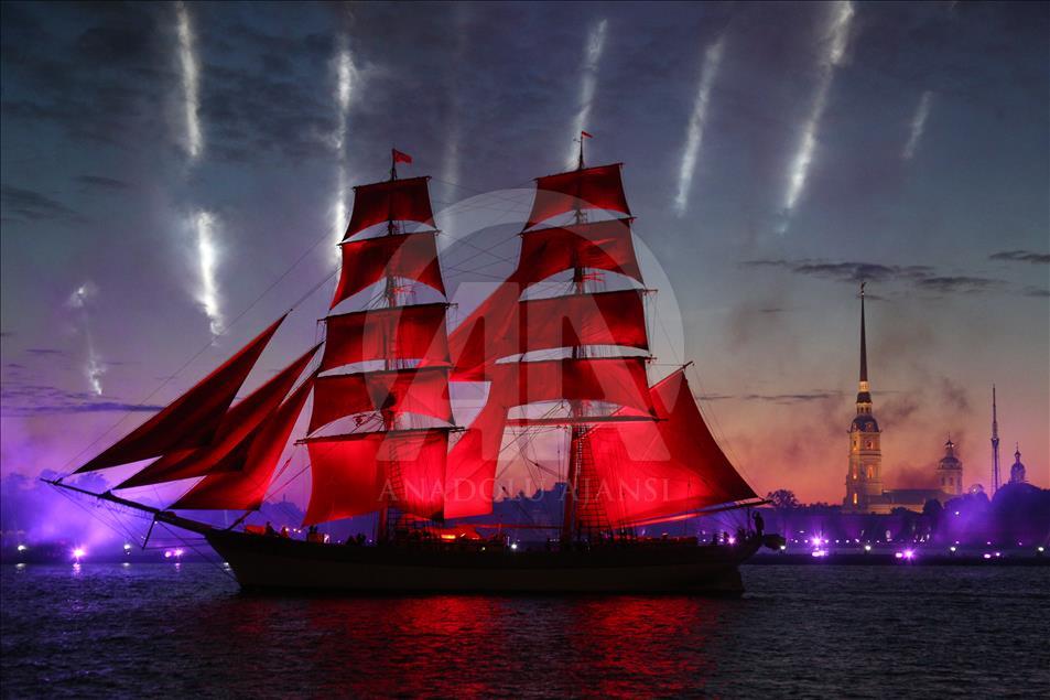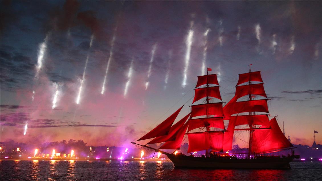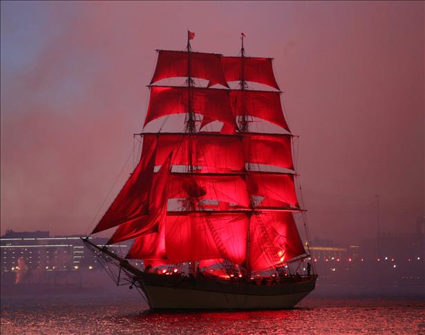 Rusya'nın St. Petersburg kentinde Beyaz Geceler Festivali kapsamında, eğitim yılının sona ermesiyle "Scarlet Sails" etkinliği gerçekleşti. Etkinlik kapsamında, tamamı kırmızı yelkenlerden oluşan bir yelkenli St. Petersburg'daki Neva Nehri üzerinde havai fişekler eşliğinde süzüldü.