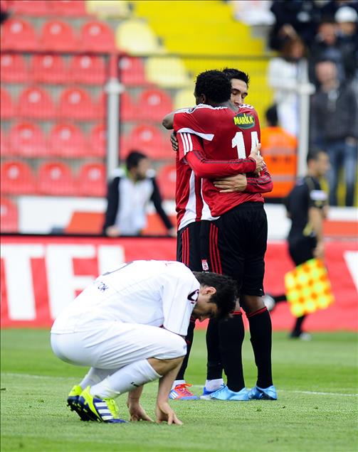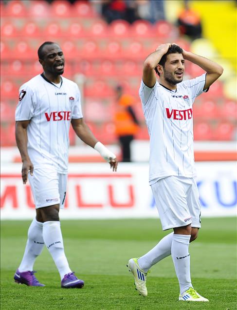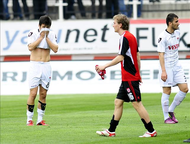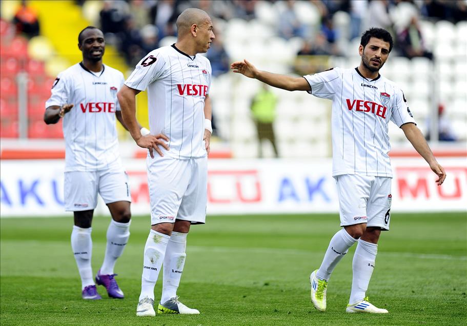 SPOR TOTO SUPER LIGI'NDE MANISASPOR ILE SIVASSPOR KARSILASTI. SPOR TOTO SUPER LIG'DE SEZONUN TAMAMLANMASINA IKI HAFTA KALA, MANISASPOR KUME DUSEN IKINCI TAKIM OLDU. MANISAPORLU FUTBOLCULAR UZUNTU YASADI. (ANADOLU AJANSI - KENAN CIMEN) (20120325)KENAN CIMEN