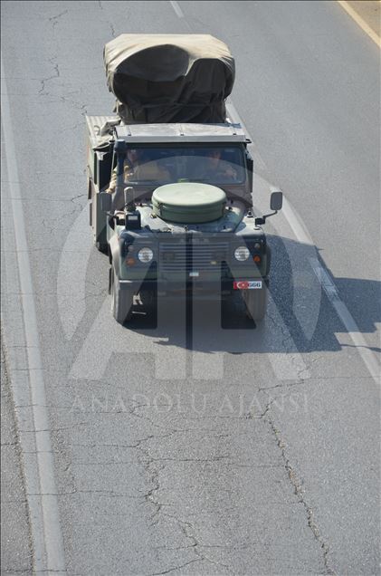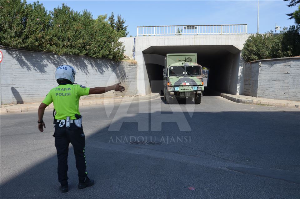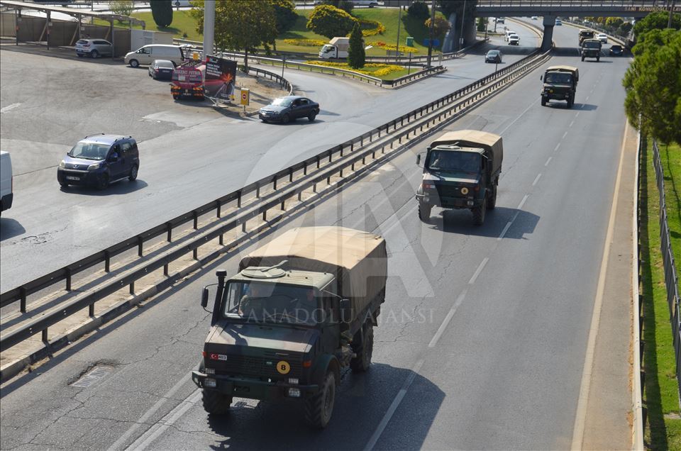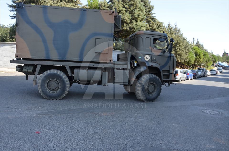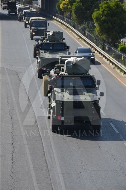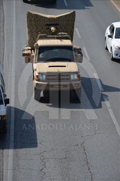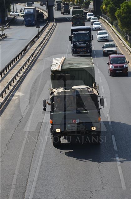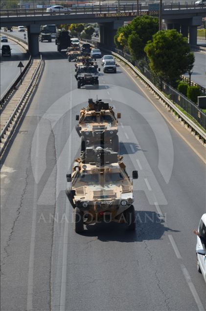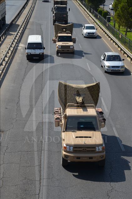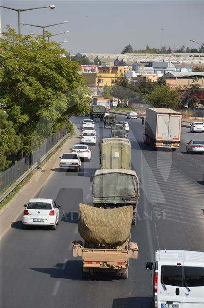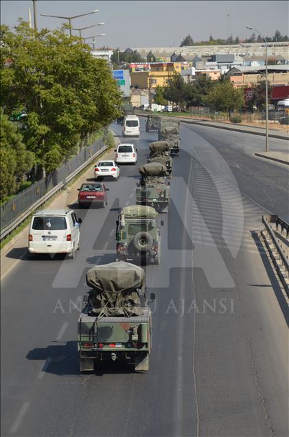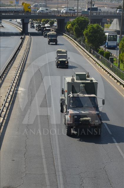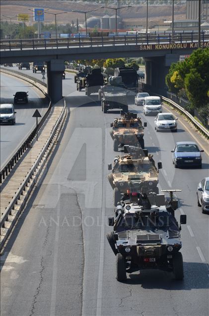 Türk Silahlı Kuvvetleri (TSK) tarafından Suriye sınırındaki askeri birliklere askeri araç ve zırhlı personel taşıyıcılar ile komando takviyesi yapıldı. Gaziantep'te konuşlu 5. Zırhlı Tugay Komutanlığı'nda bulunan 11. Komando Tugayına ait zırhlı araçlar, personellerin bulunduğu otobüsler ve mühimmat ile yaşam malzemelerinin yer aldığı tırların yer aldığı konvoy, Şanlıurfa'ya doğru hareket etti. ( Muhammed Semiz - Anadolu Ajansı )Muhammed Semiz