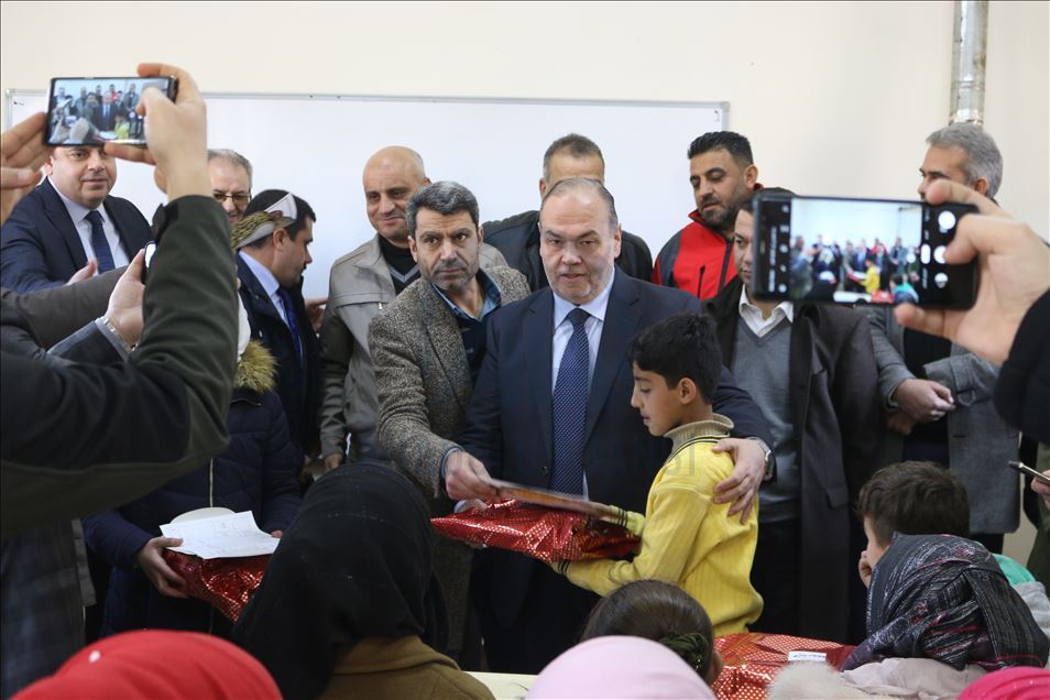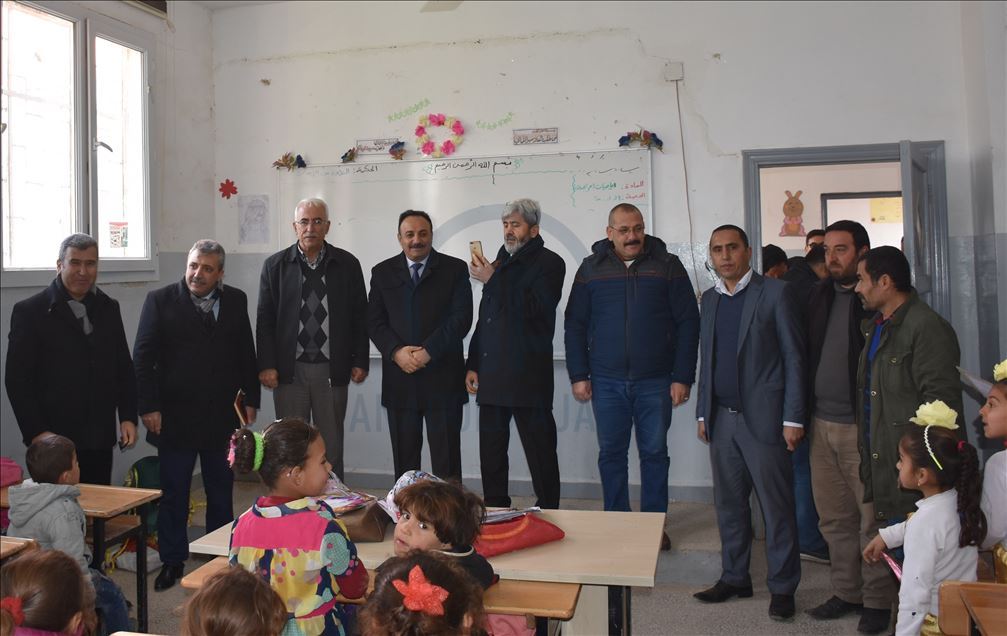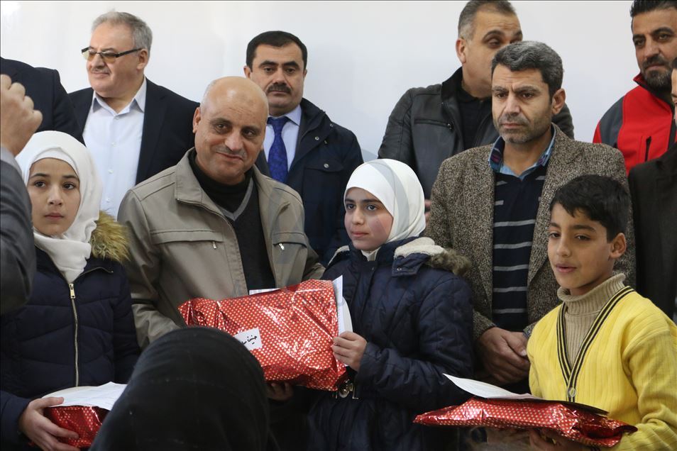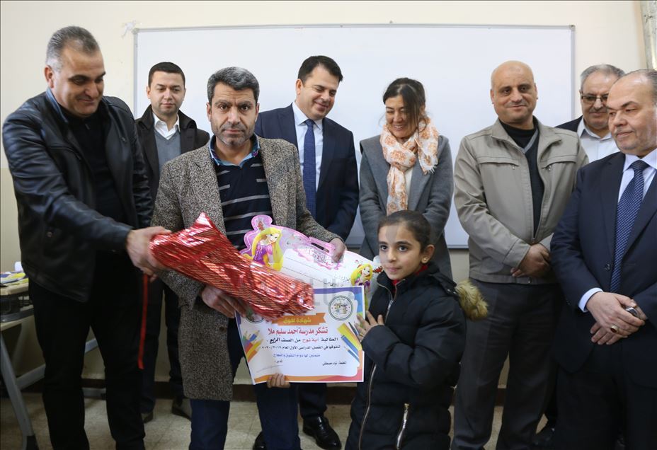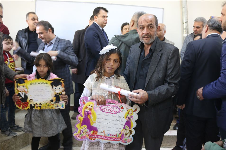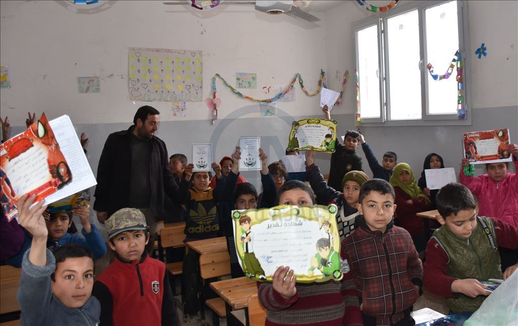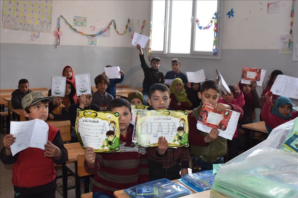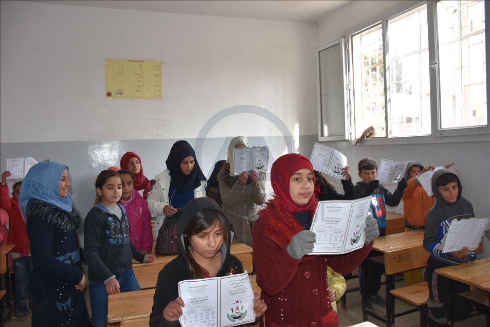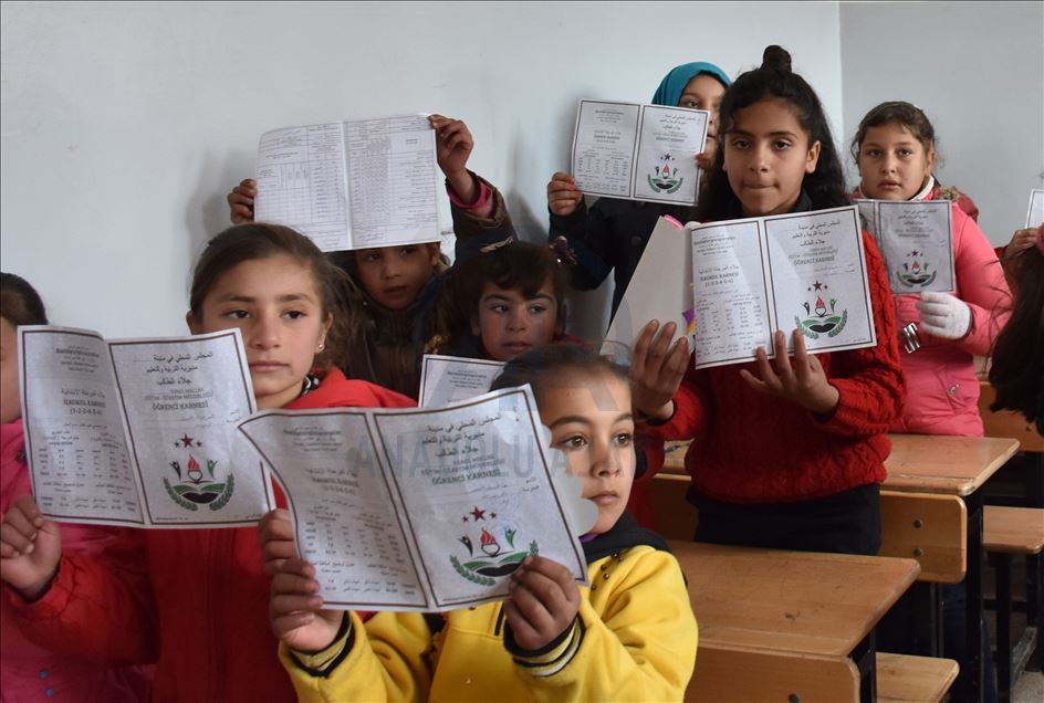 Suriye'nin kuzeyindeki Fırat Kalkanı ve Zeytin Dalı Harekatı bölgelerindeki okullarda eğitim gören yaklaşık 200 bin öğrenci karne aldı. Kilis Milli Eğitim Müdürlüğü, Çobanbey'deki er-Rifiye İlkokulu'nda tören hazırladı. ( Saher el-Hacci - Anadolu Ajansı )Saher el-Hacci