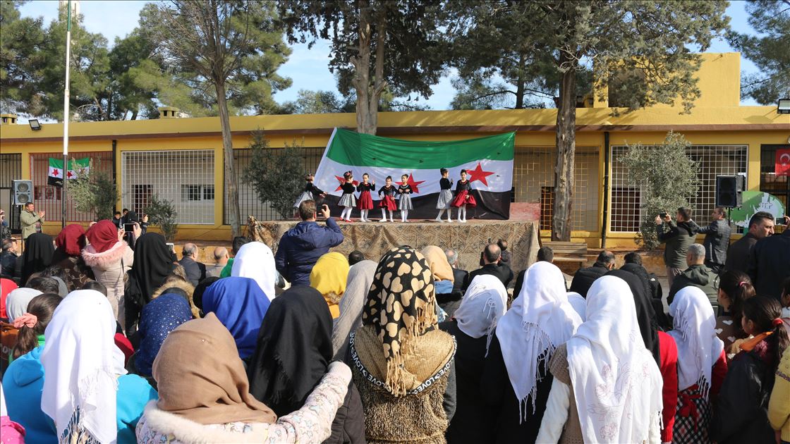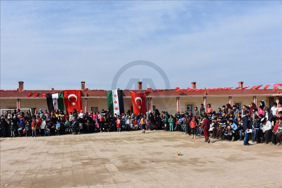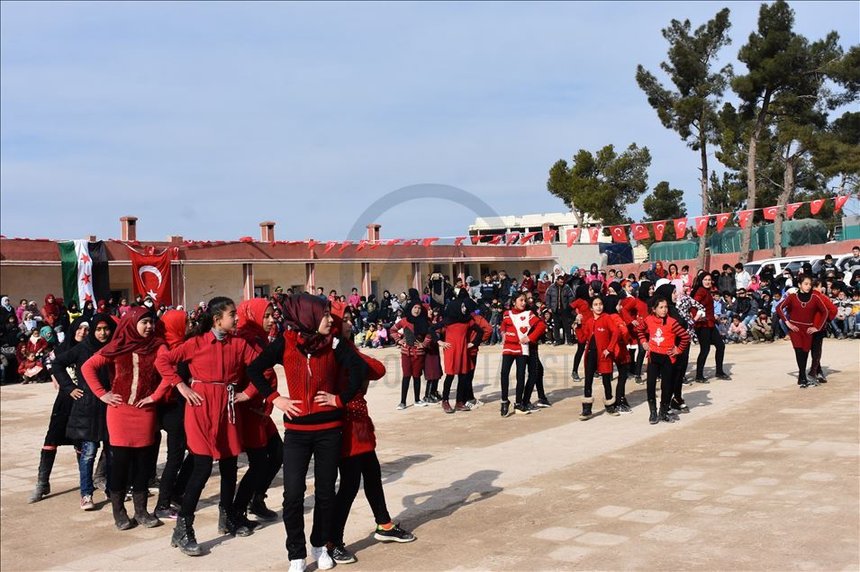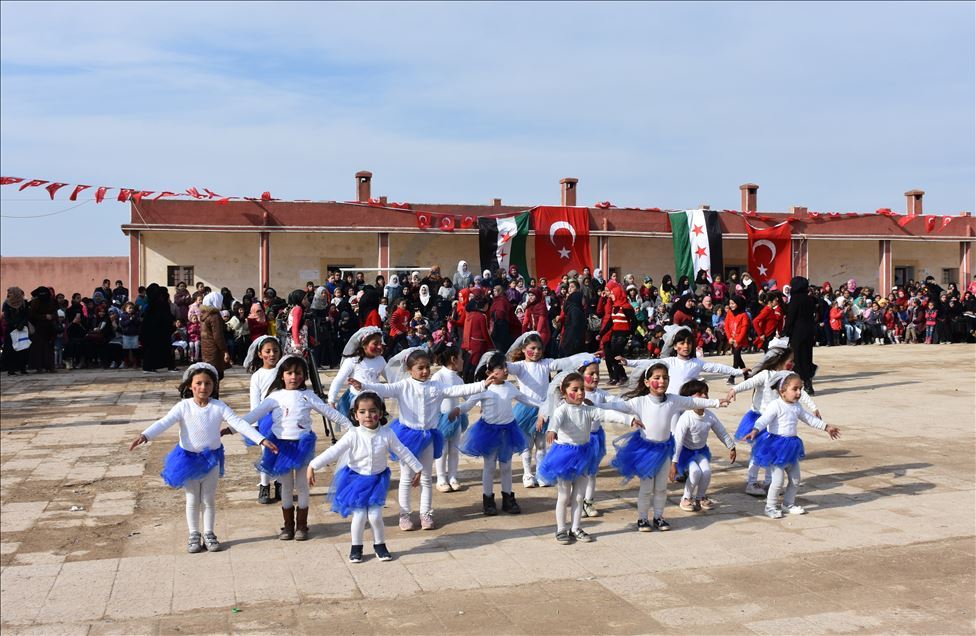 Suriye'nin kuzeyindeki Fırat Kalkanı ve Zeytin Dalı Harekatı bölgelerindeki okullarda eğitim gören yaklaşık 200 bin öğrenci karne aldı. Kilis Milli Eğitim Müdürlüğü, Çobanbey'deki er-Rifiye İlkokulu'nda tören hazırladı. Törende öğrenciler dans gösterilerini sergiledi.
