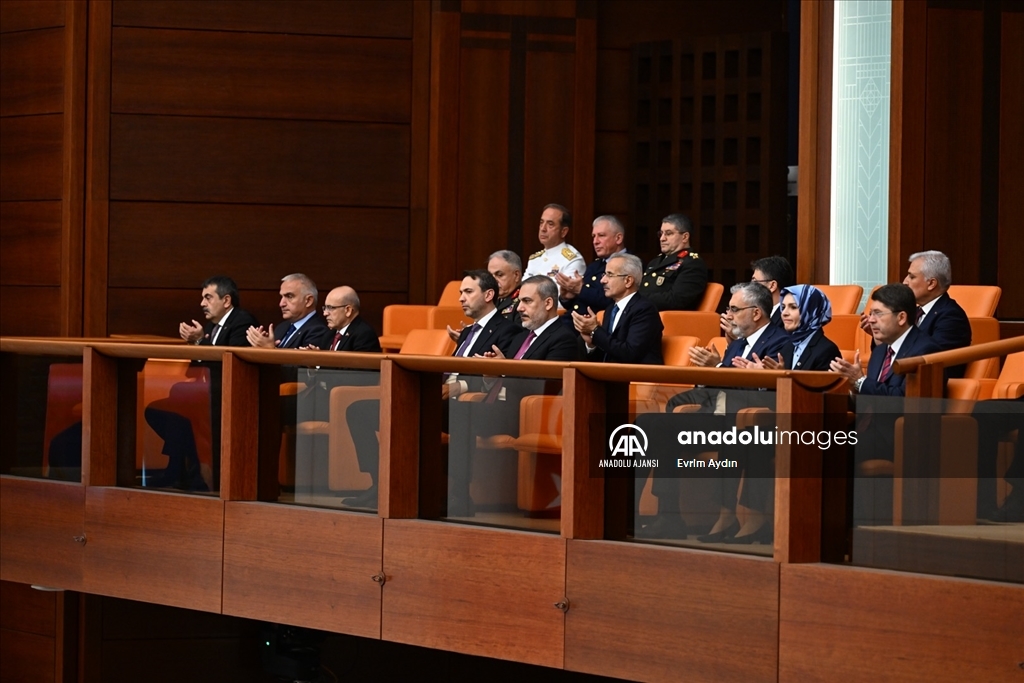 Türkiye Büyük Millet Meclisi (TBMM) Genel Kurulu, 28. Dönem 2. Yasama Yılı'nın başlaması dolayısıyla TBMM Başkanı Numan Kurtulmuş başkanlığında toplandı. Toplantıyı, Dışişleri Bakanı Hakan Fidan(sağ 3), Adalet Bakanı Yılmaz Tunç (sağda), Ticaret Bakanı Ömer Bolat(sağ 3), Aile ve Sosyal Hizmetler Bakanı Mahinur Özdemir Göktaş(sağ 2), Hazine ve Maliye Bakanı Mehmet Şimşek (so l3), Kültür ve Turizm bakanı Mehmet Nuri Ersoy (sol 2) ile Milli Eğitim Bakanı Yusuf Tekin (solda) de izledi. ( Evrim Aydın - Anadolu Ajansı )Evrim Aydın