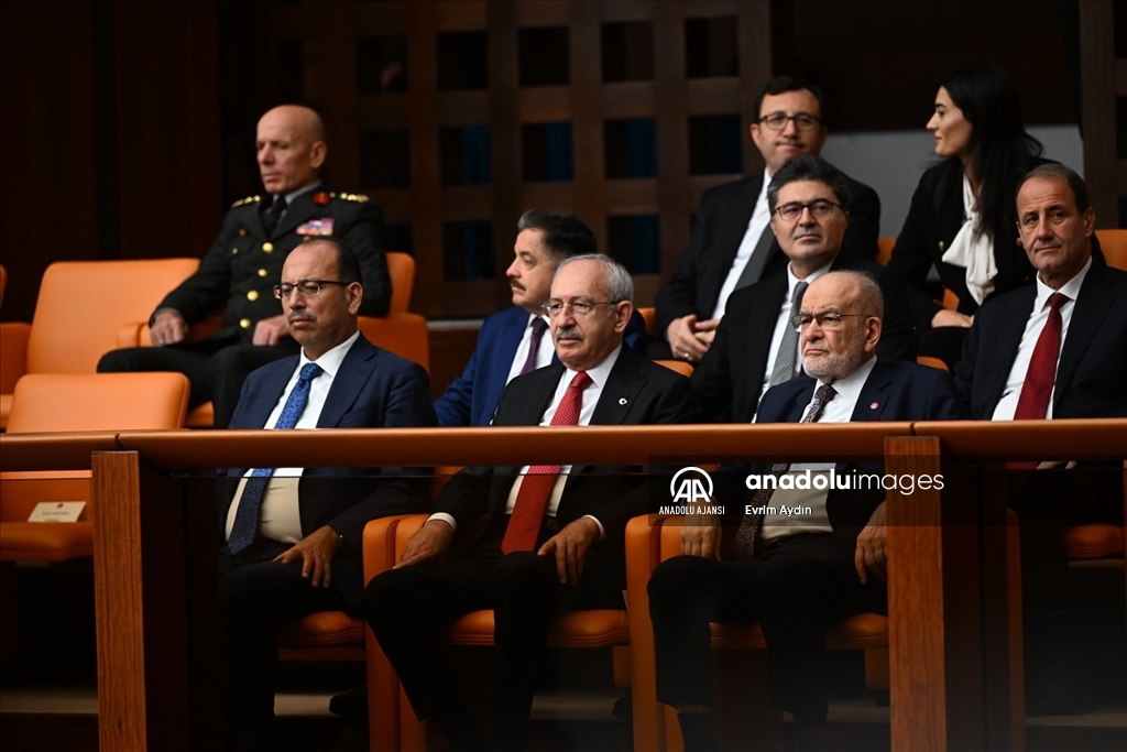 Türkiye Büyük Millet Meclisi (TBMM) Genel Kurulu, 28. Dönem 2. Yasama Yılı'nın başlaması dolayısıyla TBMM Başkanı Numan Kurtulmuş başkanlığında toplandı. Toplantıyı, CHP Genel Başkanı Kemal Kılıçdaroğlu(sağ 2) ile Saadet Partisi Genel Başkanı Temel Karamollaoğlu (sağda) da izledi. ( Evrim Aydın - Anadolu Ajansı )Evrim Aydın