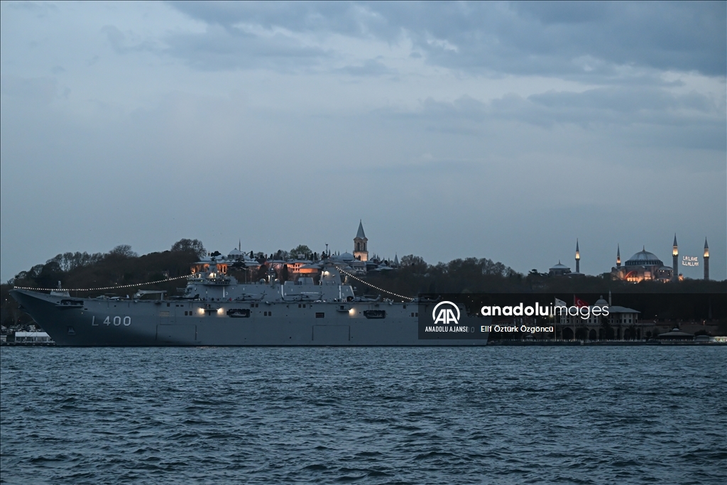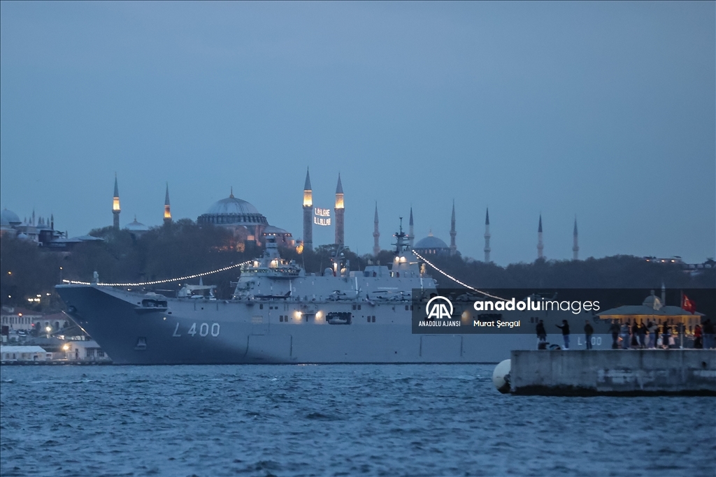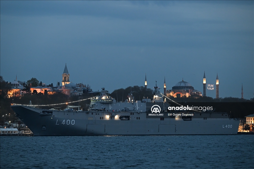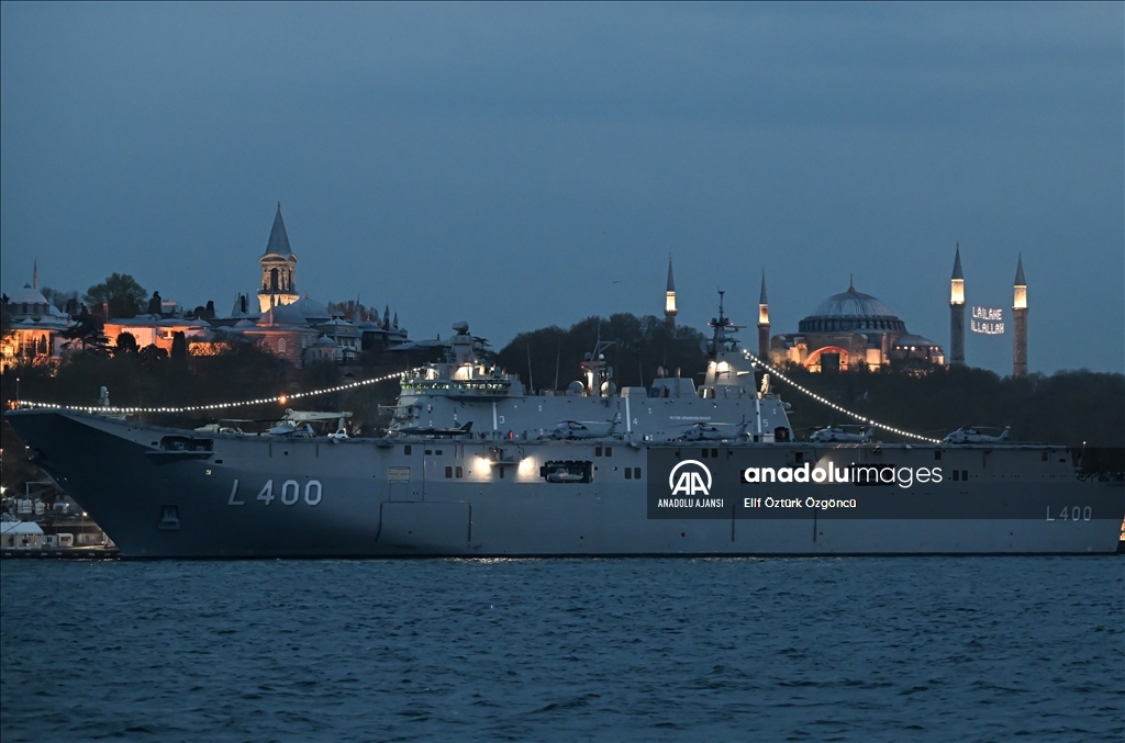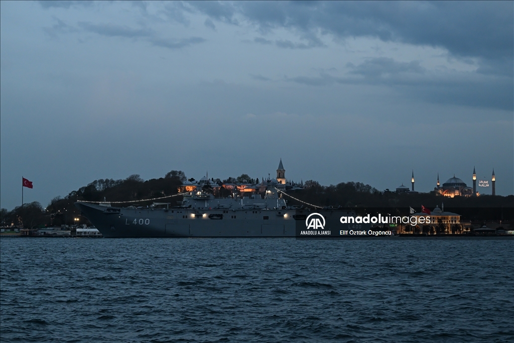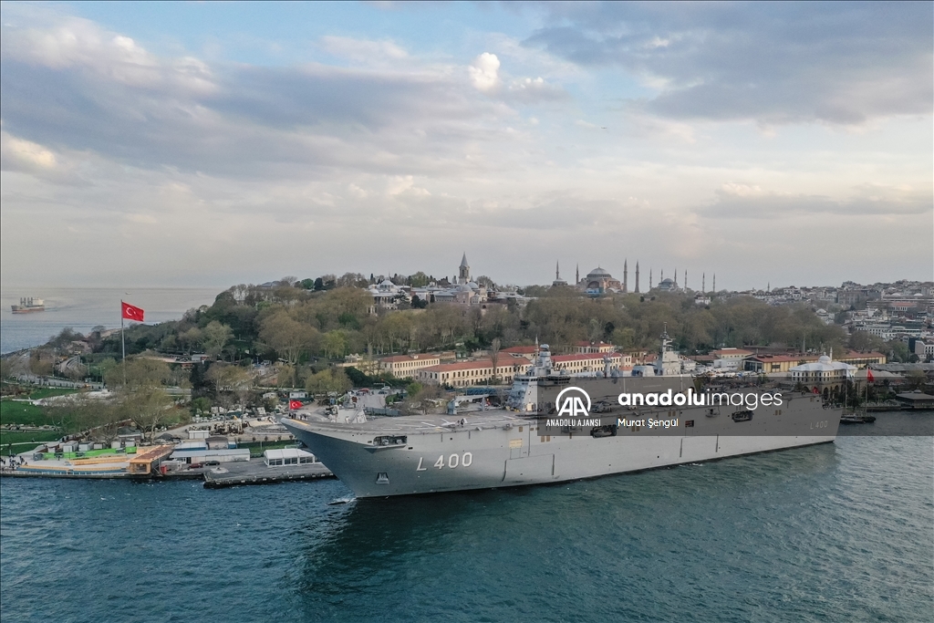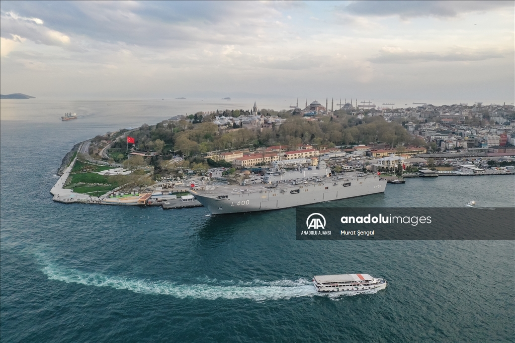 ISTANBUL, TURKIYE - APRIL 16: A photo shows TCG Anadolu, Turkiye's largest warship and the world's first unmanned combat aerial vehicle (UCAV) carrier, as it cast anchor at Sarayburnu Port in Istanbul, Turkiye on April 16, 2023. ( Berk Özkan - Anadolu Agency )Berk Özkan