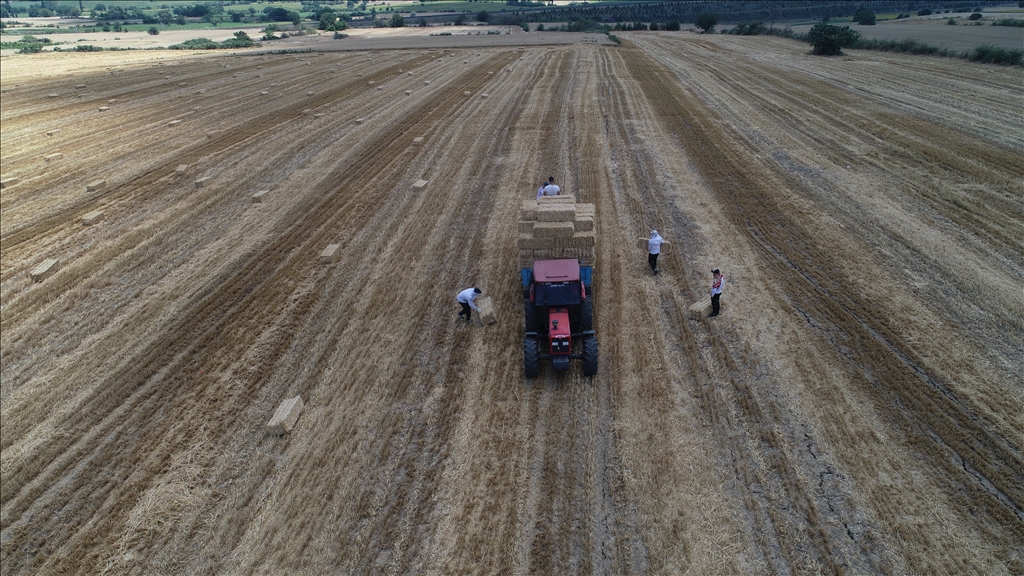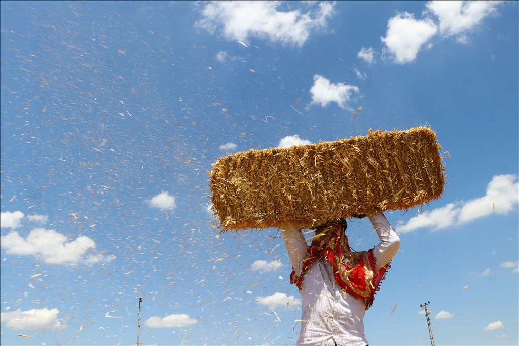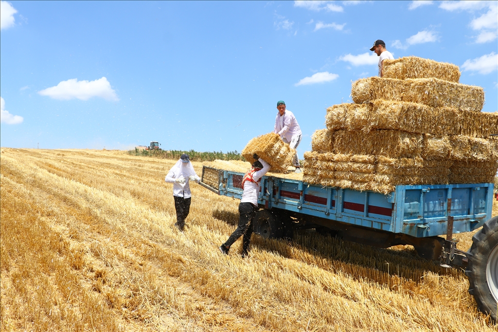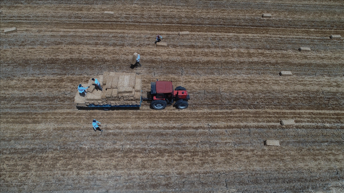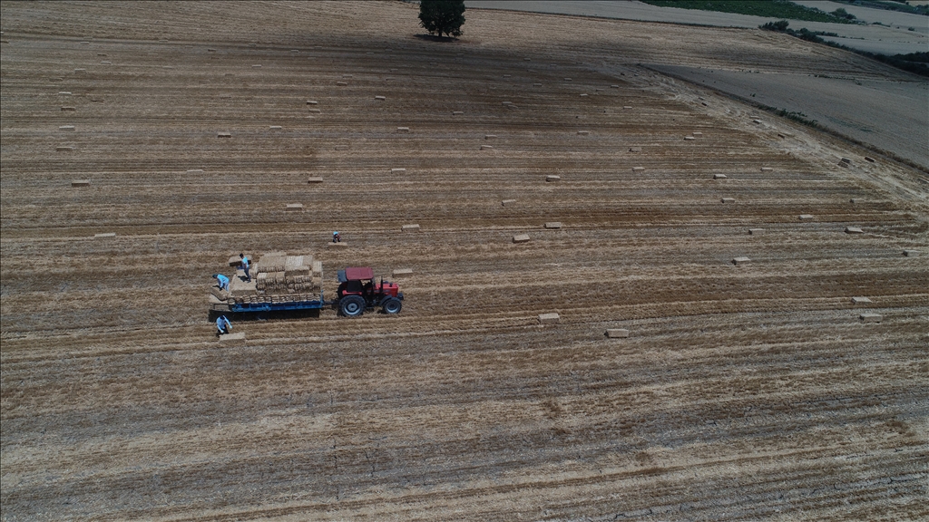 Tekirdağ'da arpa ve buğday tarlalarında hasadın ardından saman balyası taşıyan mevsimlik işçilerin zorlu mesaisi başladı.