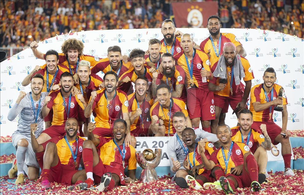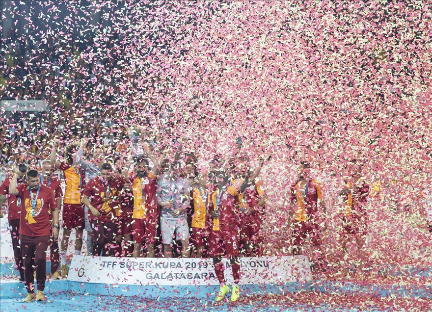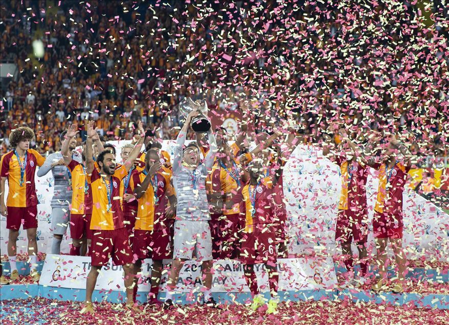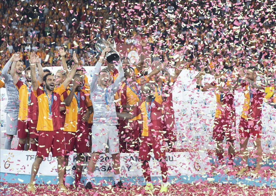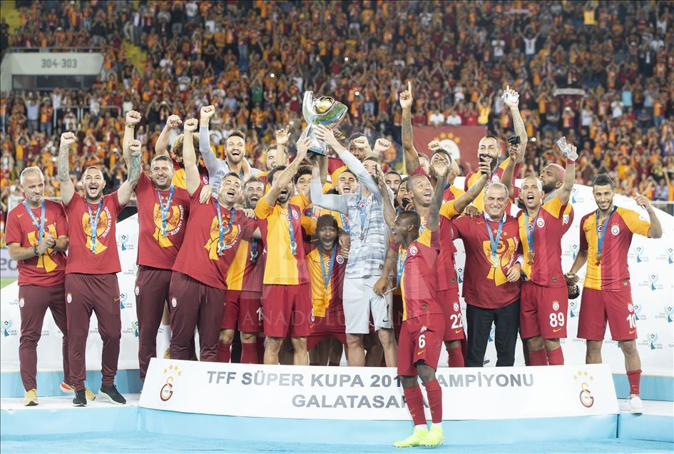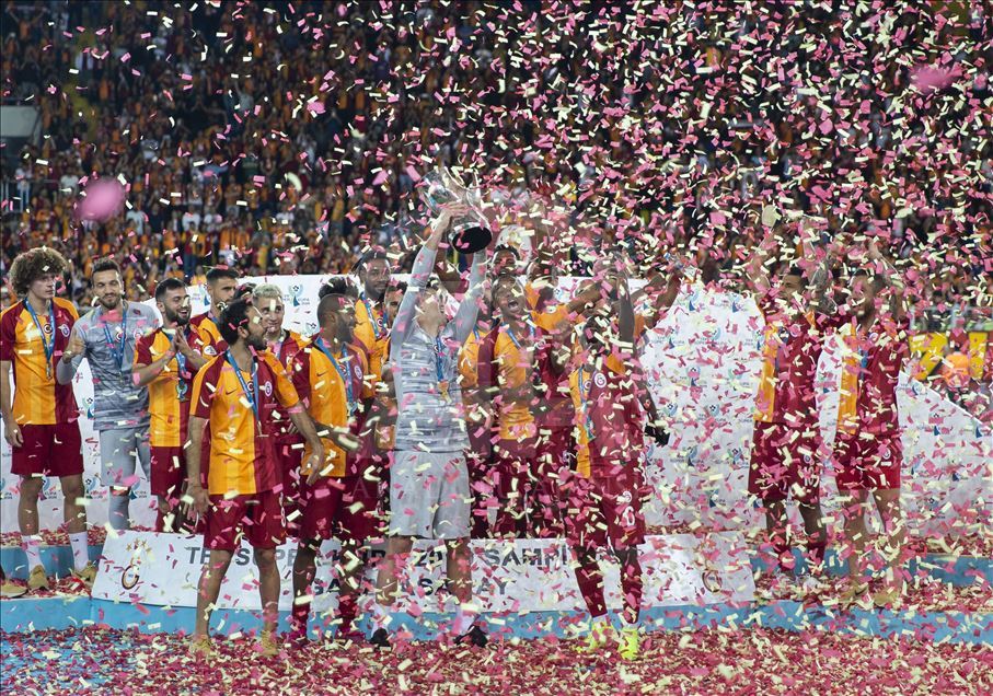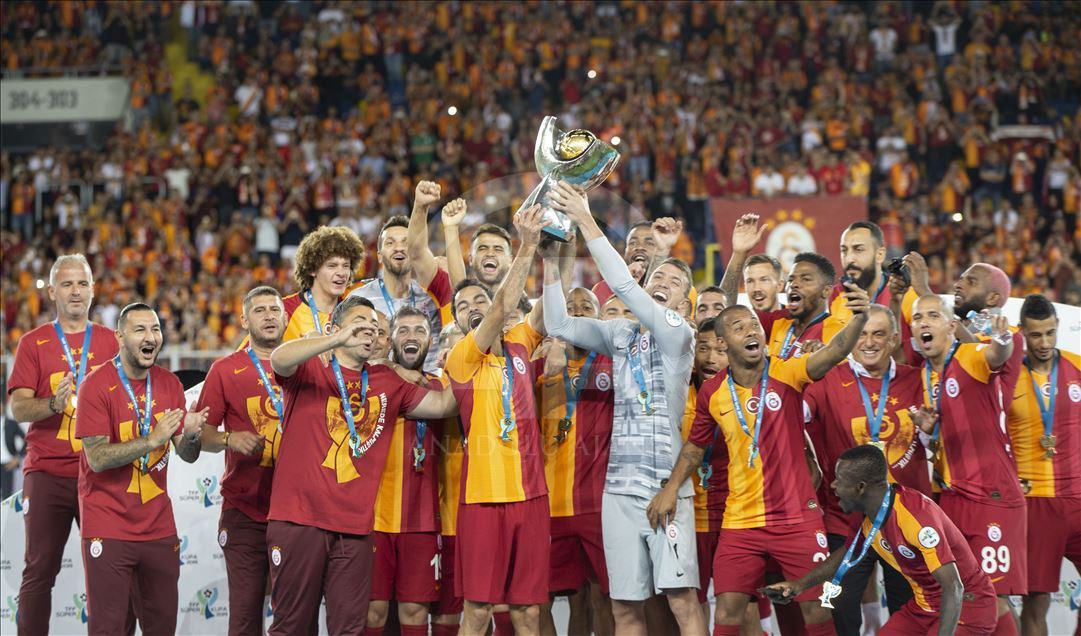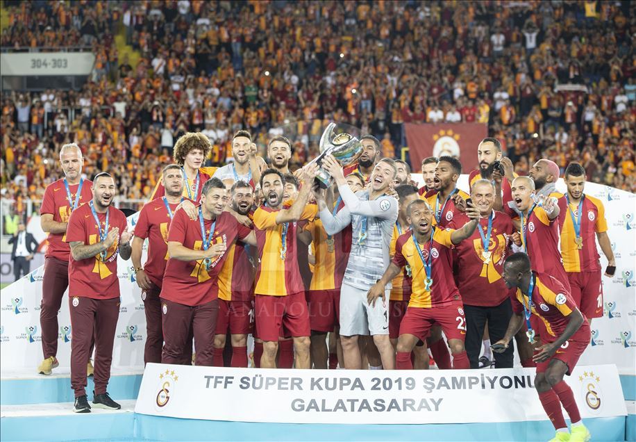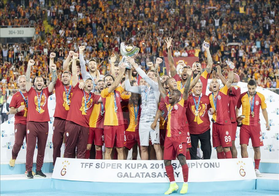 ANKARA, TURKEY - AUGUST 7: Galatasaray players hold up the trophy as they celebrate winning the 2019 Turkish Super Cup after the match between Galatasaray and Akhisarspor at Eryaman Stadium in Ankara, Turkey on August 7, 2019. ( Emin Sansar - Anadolu Agency )Emin Sansar