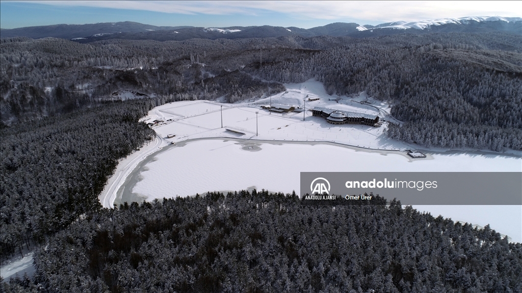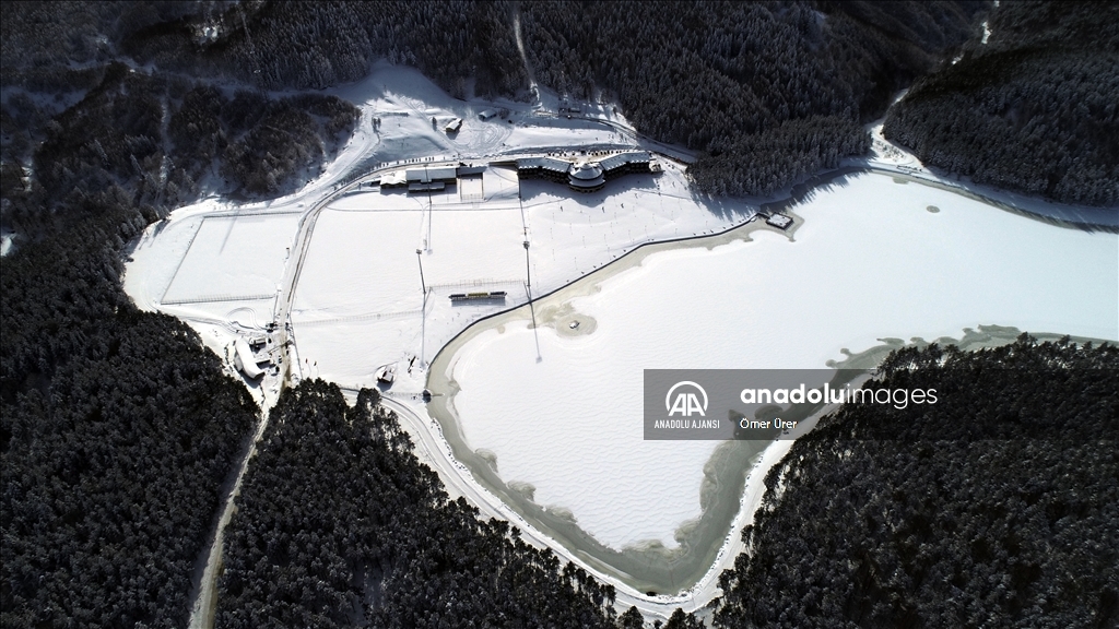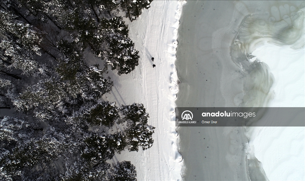 Düzce'nin Kaynaşlı ilçesinde yer alan doğal güzellikleriyle ünlü Topuk Yaylası'ndaki göletin yüzeyi buzla kaplandı.
