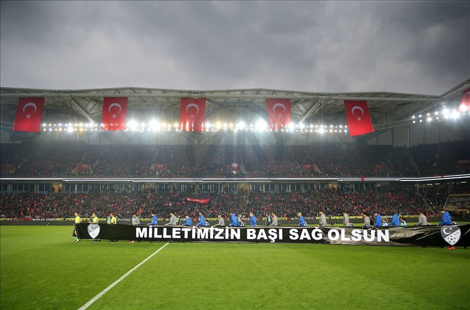 Süper Lig'in 24. haftasında Trabzonspor ile Çaykur Rizespor karşılaştı. Suriye'nin İdlib kentinde, 33 askerin şehit edildiği Esed rejimi unsurlarının saldırısı nedeniyle nedeniyle her iki takım oyuncuları da karşılaşmaya "milletimizin başı sağ olsun" yazılı pankartla çıktı. ( Hakan Burak Altunöz - Anadolu Ajansı )Hakan Burak Altunöz