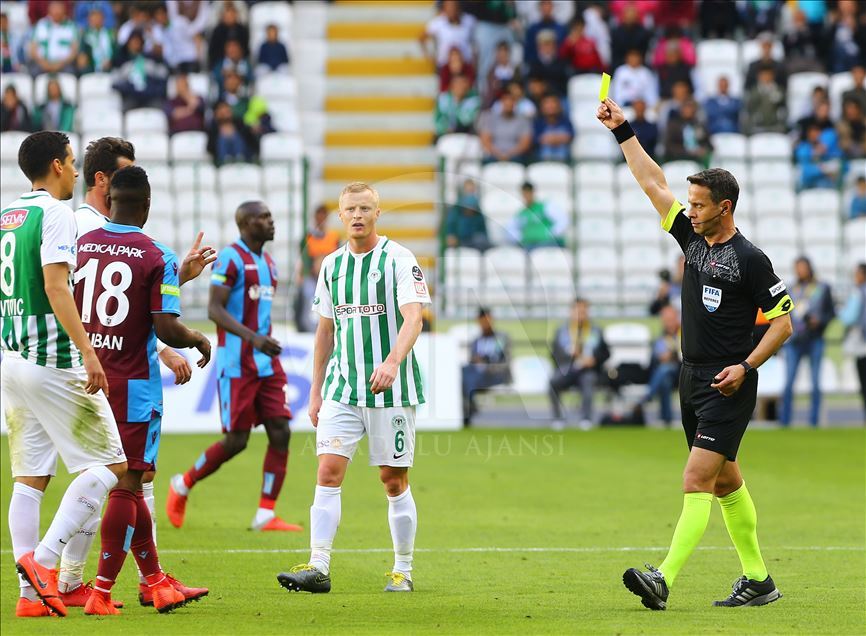 Atiker Konyaspor, Spor Toto Süper Lig'in 32. haftasında, Konya Büyükşehir Belediyesi Stadı’nda, Trabzonspor ile karşılaştı. Bir pozisyon sonrasında Trabzonsporlu futbolcuların itirazı üzerine karşılaşmanın hakemi Halis Özkahya (sağda) Video Yardımcı Hakem (VAR) uygulamasına gittikten sonra penaltı kararı verdi. ( Abdullah Coşkun - Anadolu Ajansı )Abdullah Coşkun