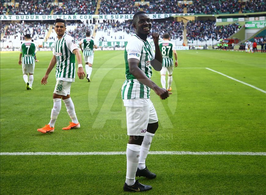 Atiker Konyaspor, Spor Toto Süper Lig'in 32. haftasında, Konya Büyükşehir Belediyesi Stadı’nda, Trabzonspor ile karşılaştı. Takımını 2-1 öne geçiren golü atan Konyasporlu Fofana (önde) sevinç yaşadı. ( Abdullah Coşkun - Anadolu Ajansı )Abdullah Coşkun