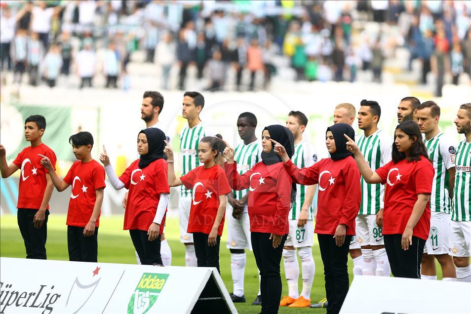 Atiker Konyaspor, Spor Toto Süper Lig'in 32. haftasında, Konya Büyükşehir Belediyesi Stadı’nda, Trabzonspor ile karşılaştı. İşitme Engelliler Haftası dolayısıyla maç başındaki İstiklal Marşı işitme engelli çocuklar tarafından işaret diliyle okundu. ( Abdullah Coşkun - Anadolu Ajansı )Abdullah Coşkun