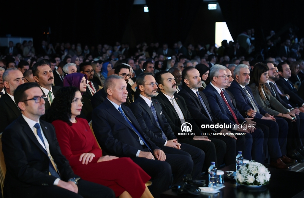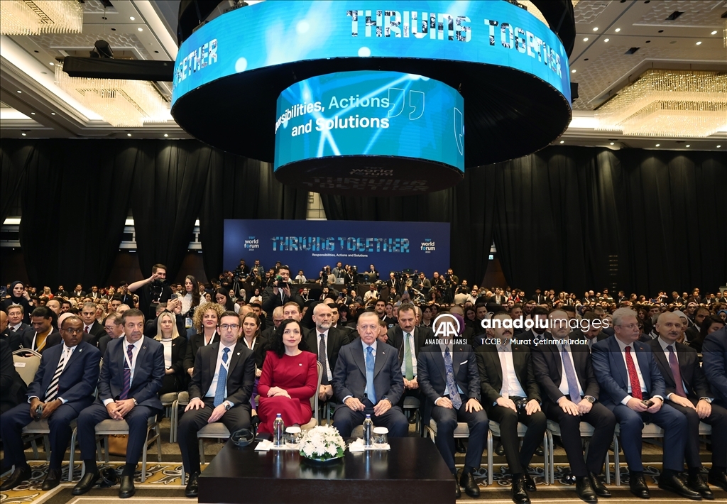 Cumhurbaşkanı Recep Tayyip Erdoğan, "Birlikte Gelişmek: Sorumluluklar, Eylemler ve Çözümler" temasıyla, bu yıl 7'nci kez, akademisyenler, gazeteciler, politikacılar ve sivil toplum kuruluşlarını bir araya getiren "TRT World Forum 2023"un açılışına katıldı. Açılışa Kosova Cumhurbaşkanı Vjosa Osmani (sol 2) ve Cumhurbaşkanlığı İletişim Başkanı Fahrettin Altun (sol 4) da katıldı. ( TCCB / Murat Çetinmühürdar - Anadolu Ajansı )TCCB / Murat Çetinmühürdar