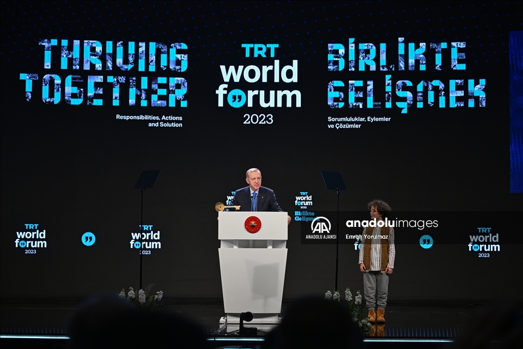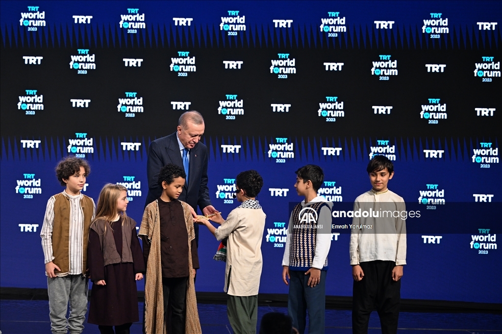 Cumhurbaşkanı Recep Tayyip Erdoğan, "Birlikte Gelişmek: Sorumluluklar, Eylemler ve Çözümler" temasıyla, bu yıl 7'nci kez, akademisyenler, gazeteciler, politikacılar ve sivil toplum kuruluşlarını bir araya getiren "TRT World Forum 2023"un açılışına katılarak konuşma yaptı. Konuşmasını yapmak üzere kürsüye çıkan Cumhurbaşkanı Erdoğan'a, çocuklar tarafından dünyadaki "Barışın anahtarı" takdim edildi. Erdoğan, burada konuşma yaptı. ( Emrah Yorulmaz - Anadolu Ajansı )Emrah Yorulmaz
