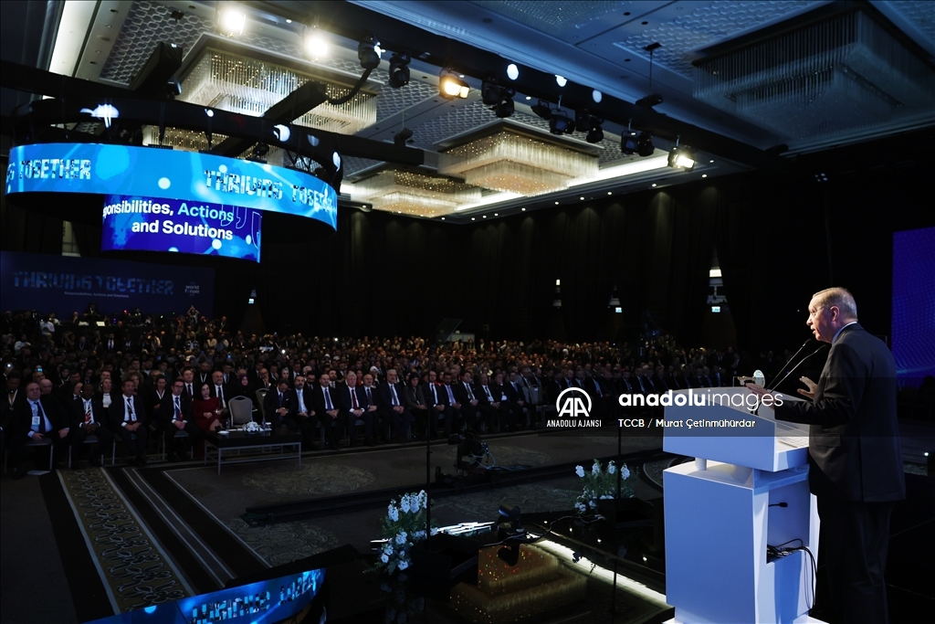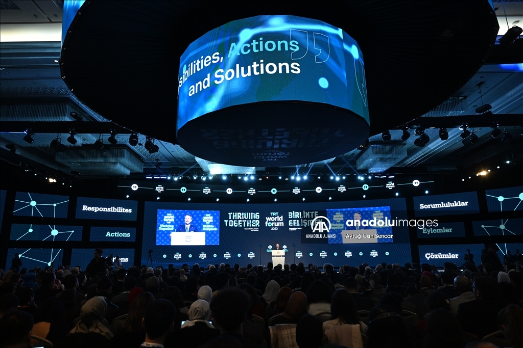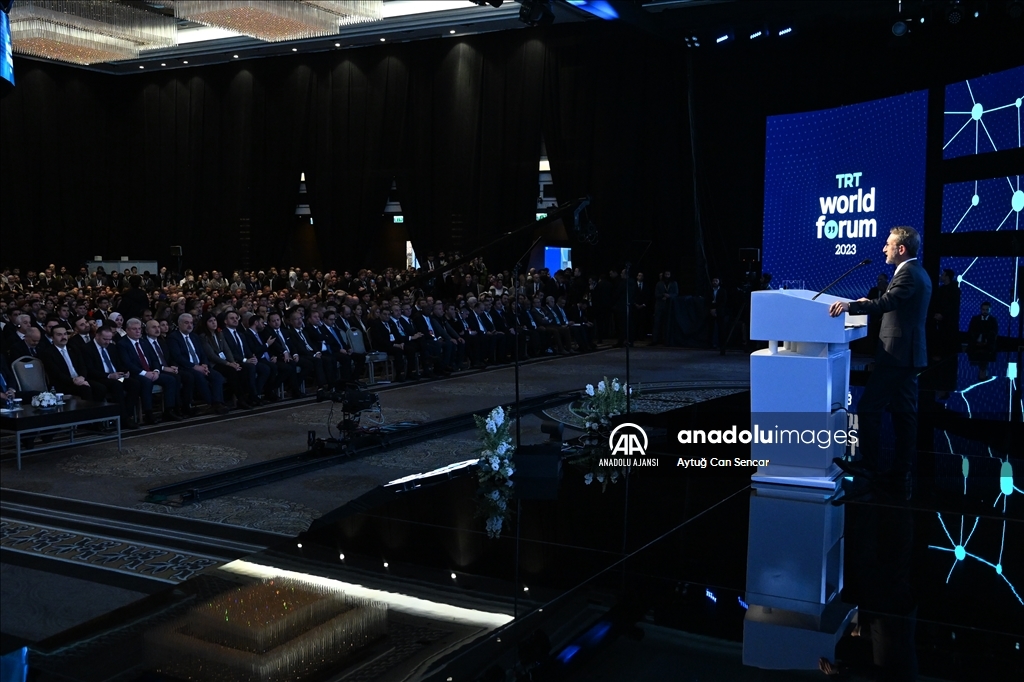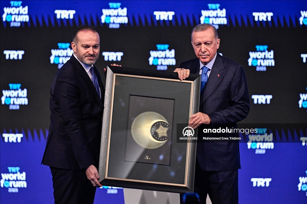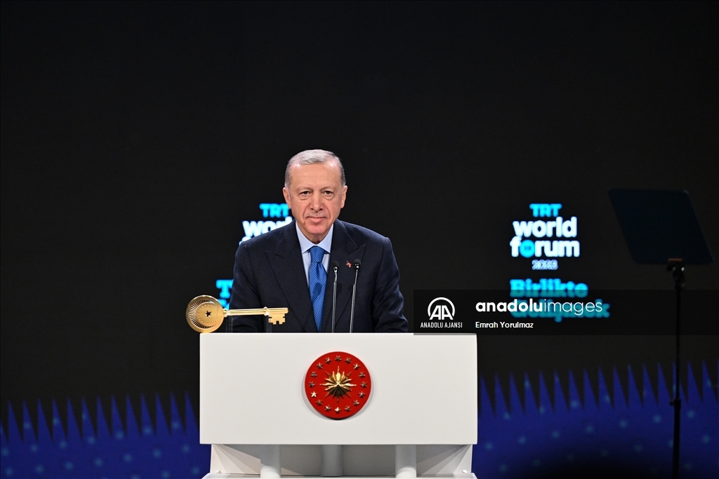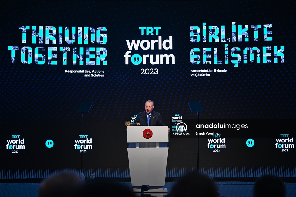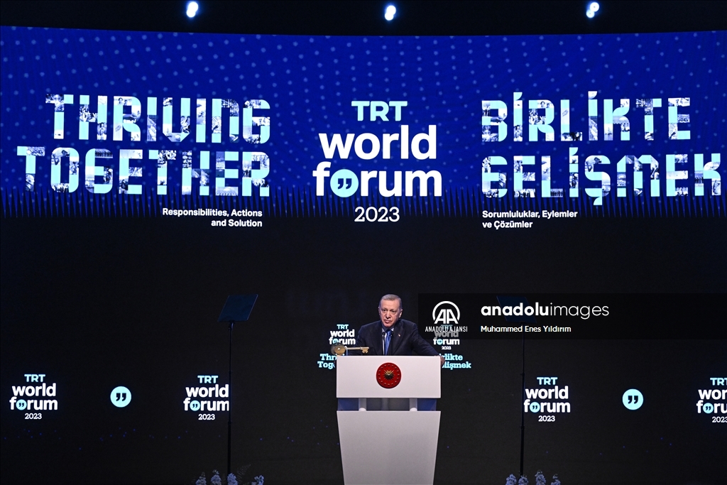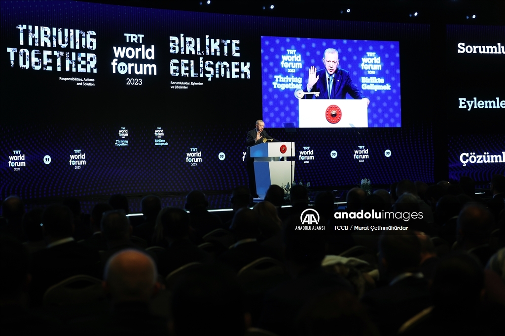 Cumhurbaşkanı Recep Tayyip Erdoğan, "Birlikte Gelişmek: Sorumluluklar, Eylemler ve Çözümler" temasıyla, bu yıl 7'nci kez, akademisyenler, gazeteciler, politikacılar ve sivil toplum kuruluşlarını bir araya getiren "TRT World Forum 2023"un açılışına katılarak konuşma yaptı. ( TCCB / Murat Çetinmühürdar - Anadolu Ajansı )TCCB / Murat Çetinmühürdar