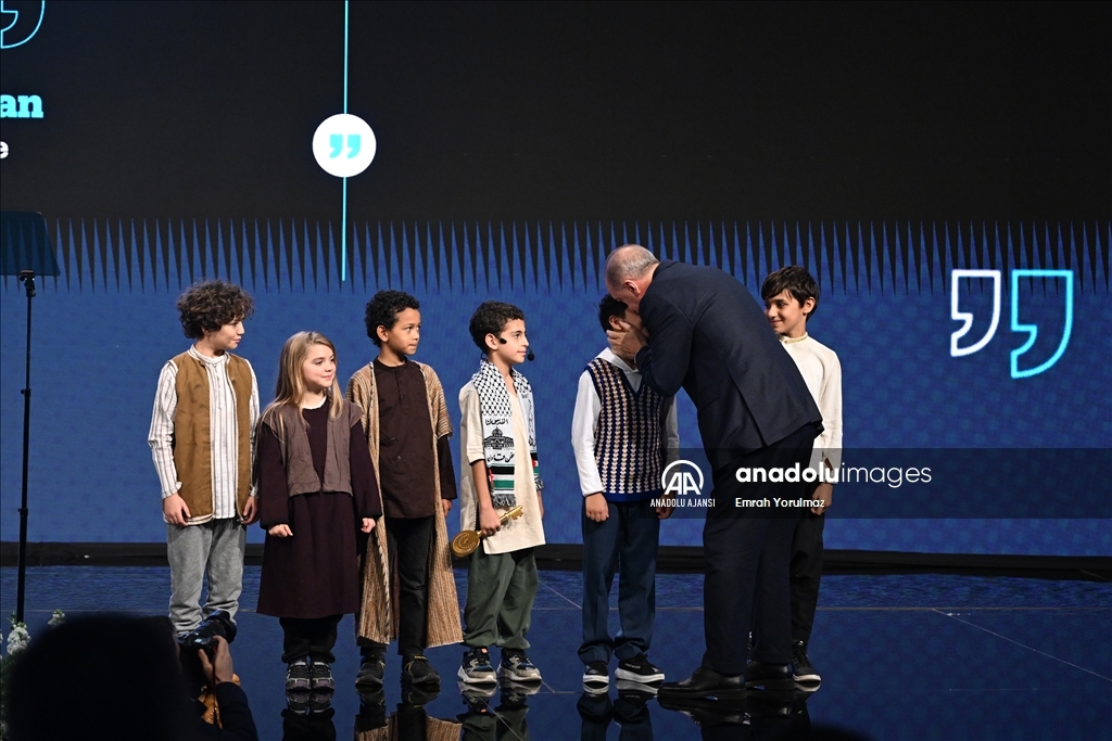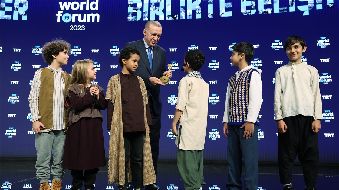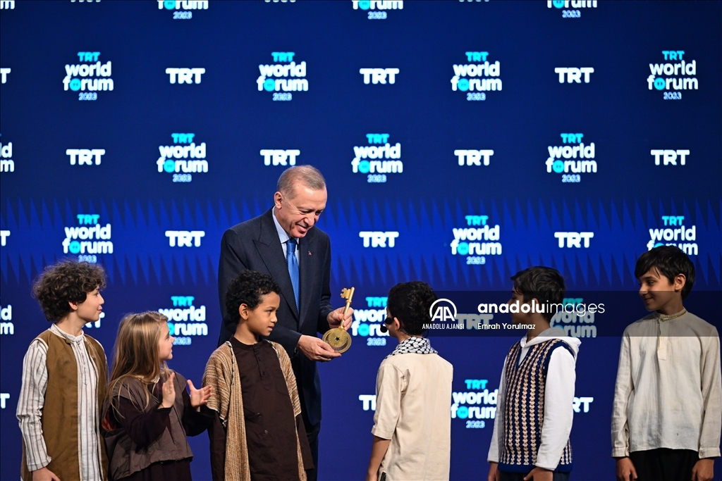 Cumhurbaşkanı Recep Tayyip Erdoğan, "Birlikte Gelişmek: Sorumluluklar, Eylemler ve Çözümler" temasıyla, bu yıl 7'nci kez, akademisyenler, gazeteciler, politikacılar ve sivil toplum kuruluşlarını bir araya getiren "TRT World Forum 2023"un açılışına katıldı. Konuşmasını yapmak üzere kürsüye çıkan Cumhurbaşkanı Erdoğan'a, çocuklar tarafından dünyadaki "Barışın anahtarı" takdim edildi. ( TCCB / Murat Çetinmühürdar - Anadolu Ajansı )TCCB / Murat Çetinmühürdar