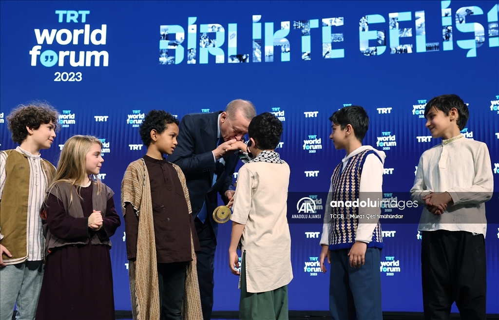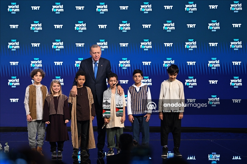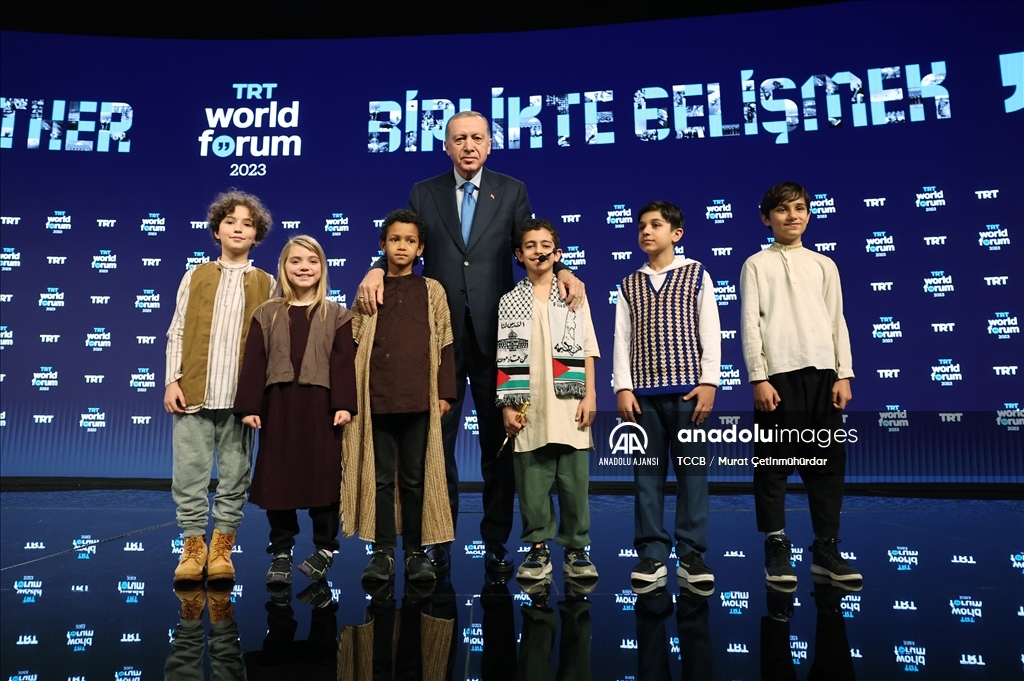 Cumhurbaşkanı Recep Tayyip Erdoğan, "Birlikte Gelişmek: Sorumluluklar, Eylemler ve Çözümler" temasıyla, bu yıl 7'nci kez, akademisyenler, gazeteciler, politikacılar ve sivil toplum kuruluşlarını bir araya getiren "TRT World Forum 2023"un açılışına katılarak konuşma yaptı. Cumhurbaşkanı Erdoğan, sahneye çıktığı sırada 6 çocuğun kendisine takdim ettiği dünyadaki "Barışın anahtarını" kürsüye koydu. ( TCCB / Murat Çetinmühürdar - Anadolu Ajansı )TCCB / Murat Çetinmühürdar