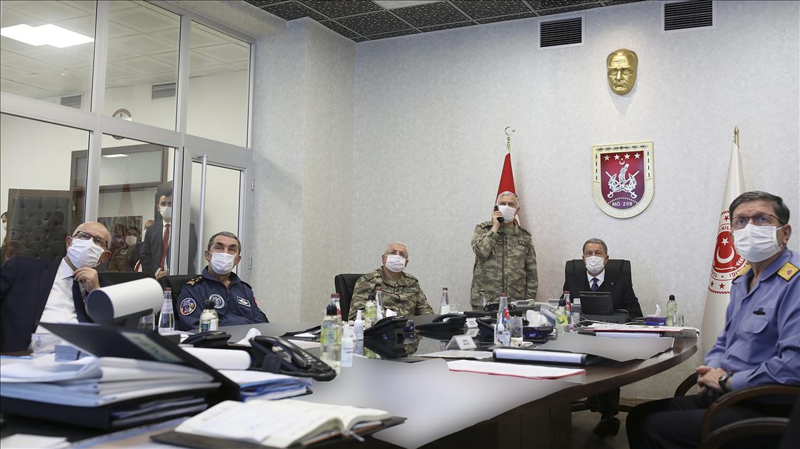 Milli Savunma Bakanı Akar ve TSK Komuta Kademesi, "Pençe-Kaplan Operasyonu"nu Kara Kuvvetleri Komutanlığı Harekat Merkezi'nden sevk ve idare ediyor. ( Arif Akdoğan - Anadolu Ajansı )Arif Akdoğan
