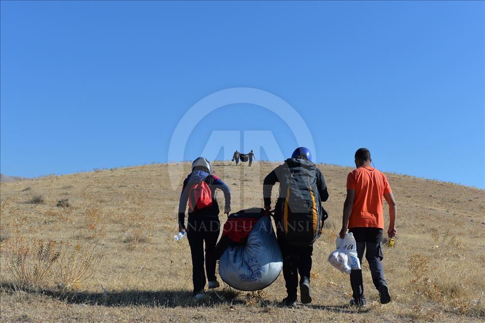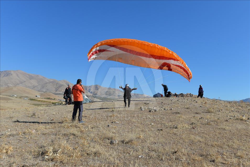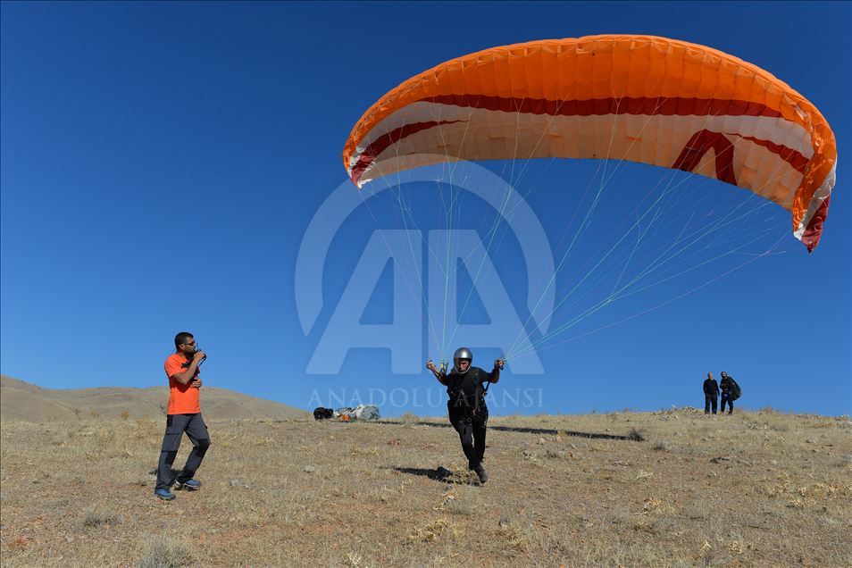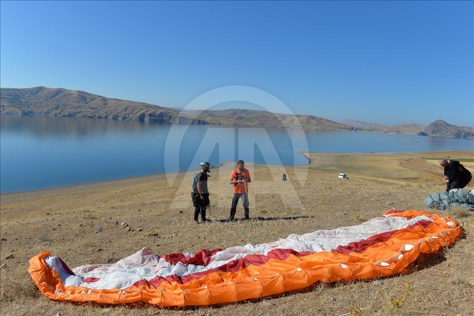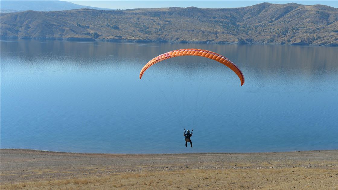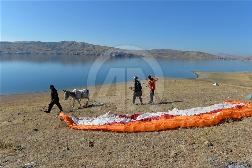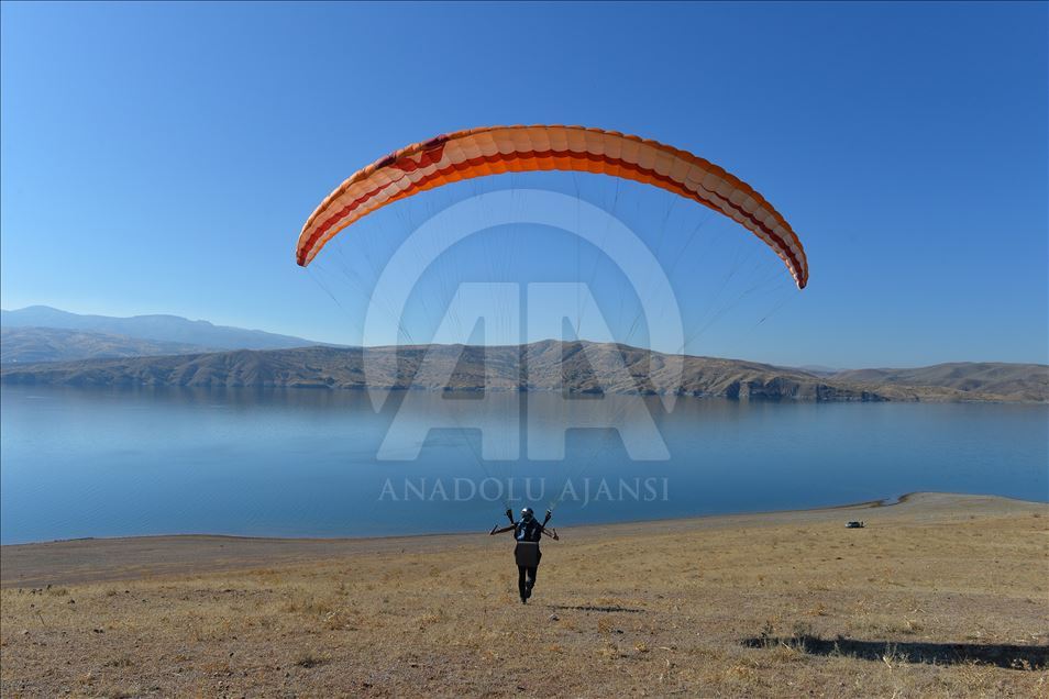 Tunceli'de 10 günlük yamaç paraşütü eğitimini tamamlayan kursiyerler Pertek ilçesindeki Keban Baraj Gölü kıyısındaki tepeden atlayış gerçekleştirdi. ( Haydar Toprakçı - Anadolu Ajansı )Haydar Toprakçı