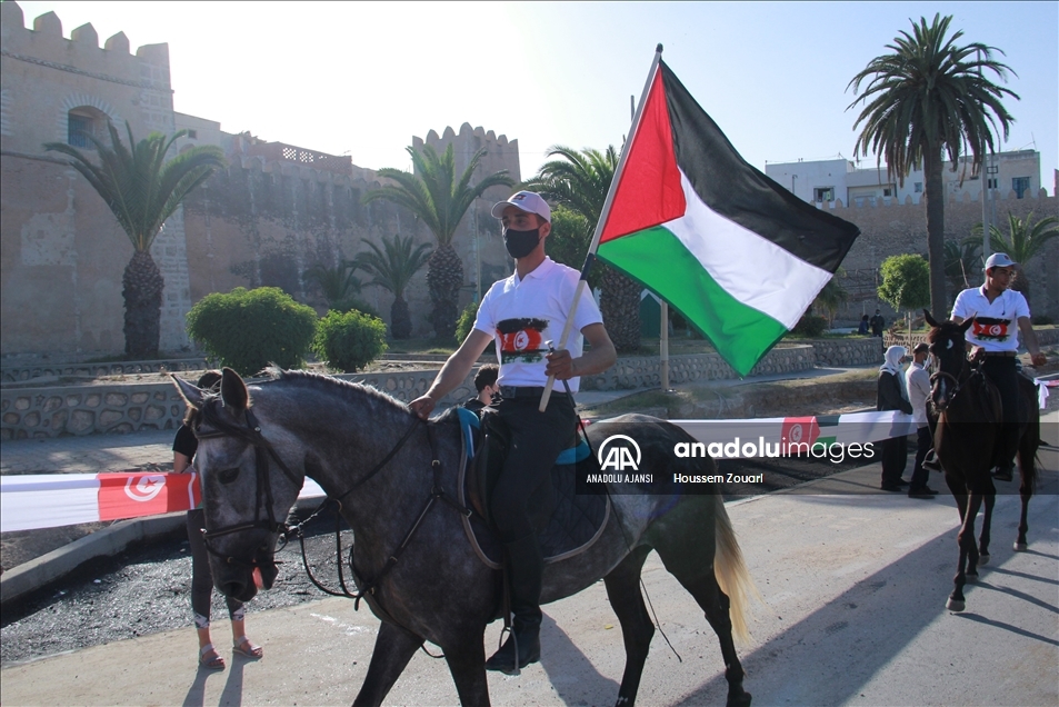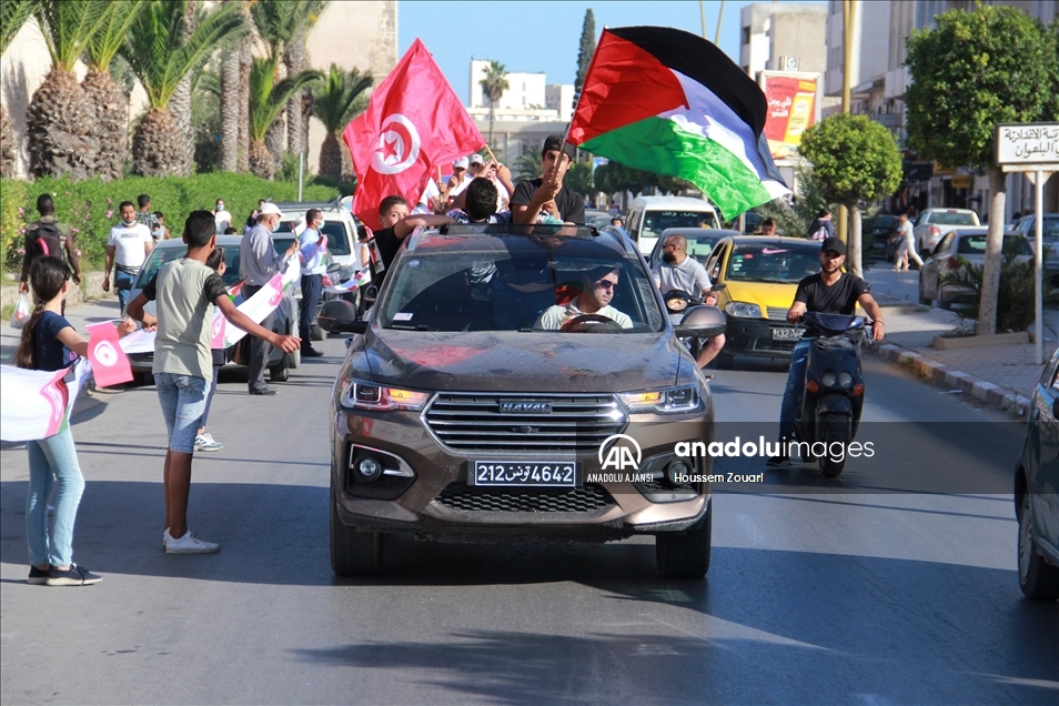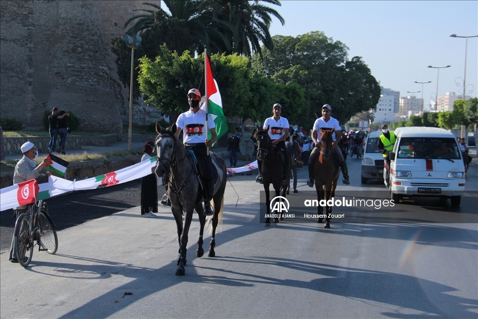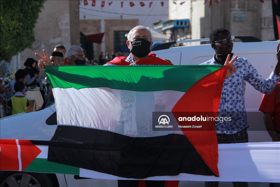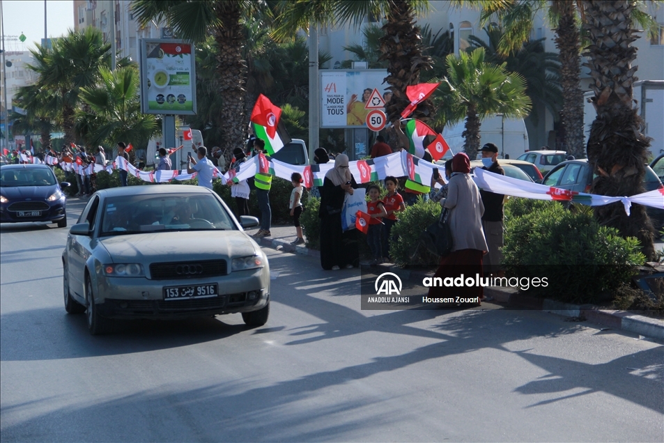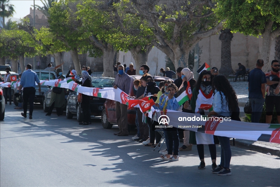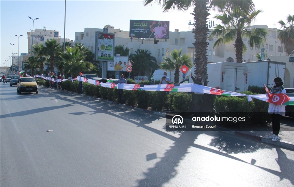 Tunus'un Safakes kentinde yüzlerce kişi, Filistin halkına destek için insan zinciri oluşturdu. Ellerinde Tunus ve Filistin bayrağı taşıyan katılımcılar, antik kent sularının dört tarafına kadar uzandı.