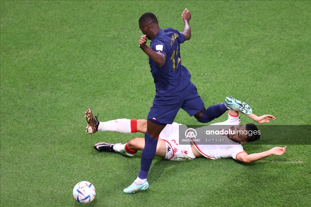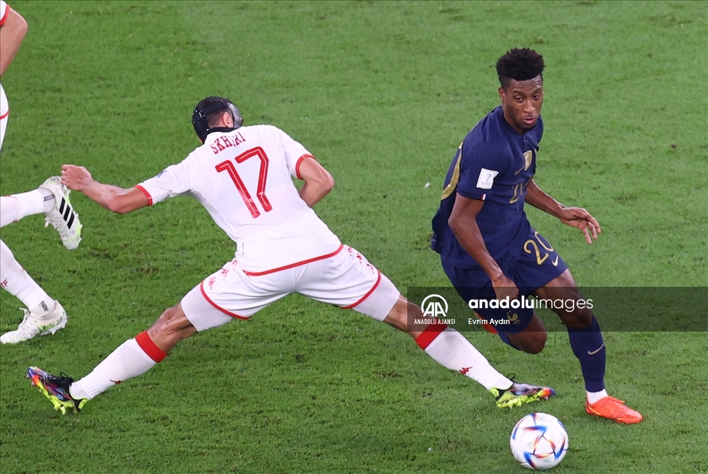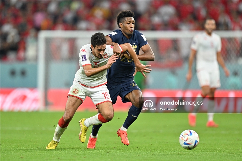 Katar'ın ev sahipliğini yaptığı 2022 FIFA Dünya Kupası’nda, D Grubu'nda yer alan Tunus ve Fransa takımları Eğitim Şehri Stadyumu'nda karşılaştı. Fransız futbolcu Kingsley Coman (20) Tunuslu Mohamed Ali Ben Romdhane (15) ile mücadele etti. ( Mustafa Yalçın - Anadolu Ajansı )Mustafa Yalçın