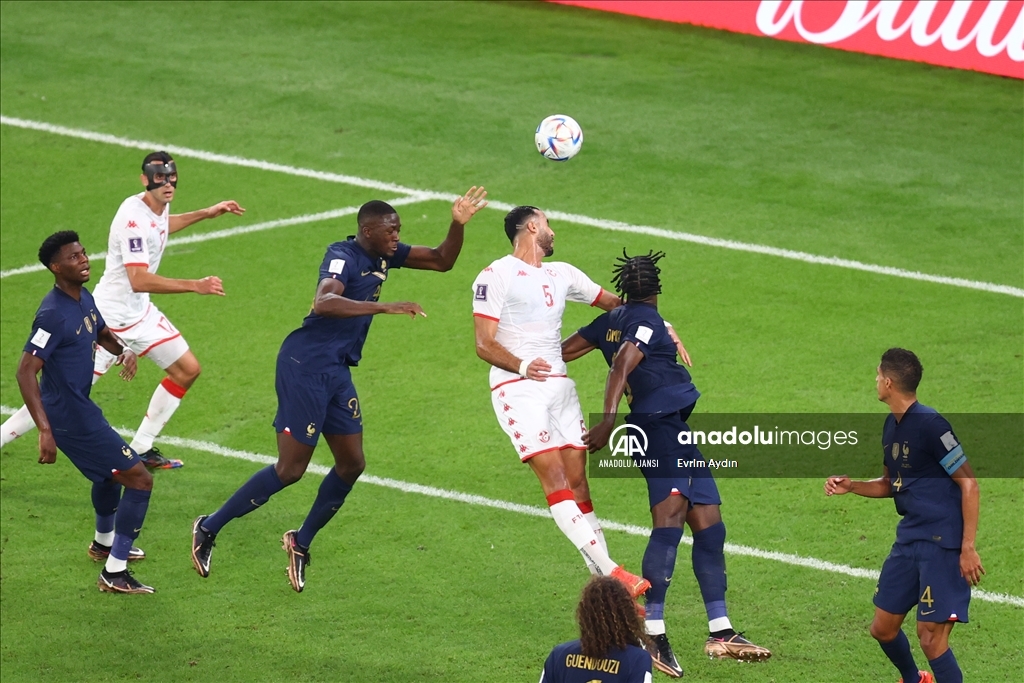 Katar'ın ev sahipliğini yaptığı 2022 FIFA Dünya Kupası’nda, D Grubu'nda yer alan Tunus ve Fransa takımları Eğitim Şehri Stadyumu'nda karşılaştı. Bir pozisyonda Tunus takımından Nader Ghandri (5) ile Fransa takımından rakipleri mücadele etti. ( Evrim Aydın - Anadolu Ajansı )Evrim Aydın