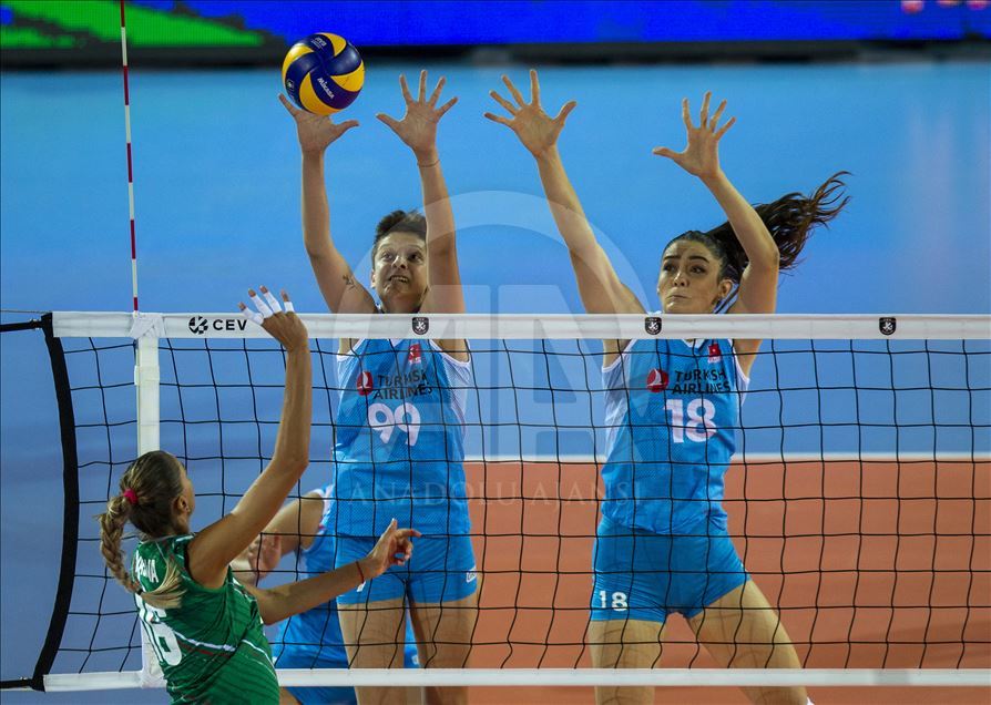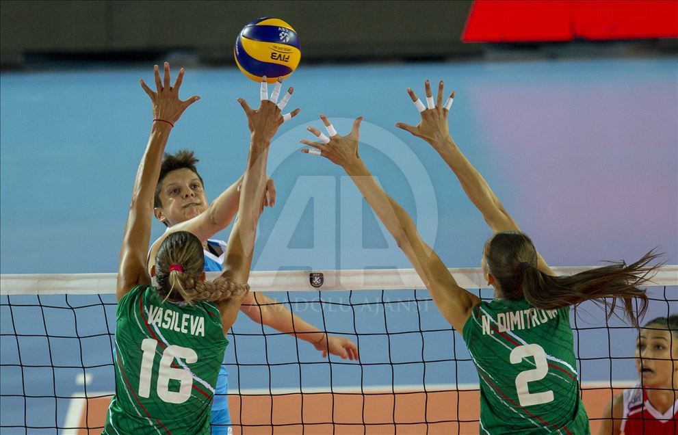 Türkiye, Polonya, Macaristan ve Slovakya'nın ortaklaşa düzenlediği 2019 Kadınlar Avrupa Voleybol Şampiyonasın A Grubu'ndaki dördüncü gün maçında Türkiye ile Bulgaristan karşılaştı. Bulgaristan'dan Vasilava (solda) Türkiye'den Ebrar (99) ve Zehra (18) ile mücadele etti. ( Emin Sansar - Anadolu Ajansı )Emin Sansar