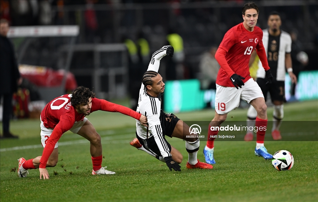 Almanya ile Türkiye, hazırlık maçında Berlin Olimpiyat Stadında karşılaştı. Bir pozisyonda Alman Milli Takım futbolcusu Leroy Sane (ortada) ile A Milli Takım futbolcuları Ferdi Kadıoğlu (solda) ve Kenan Yıldız (sağda) mücadele etti. ( Halil Sağırkaya - Anadolu Ajansı )Halil Sağırkaya