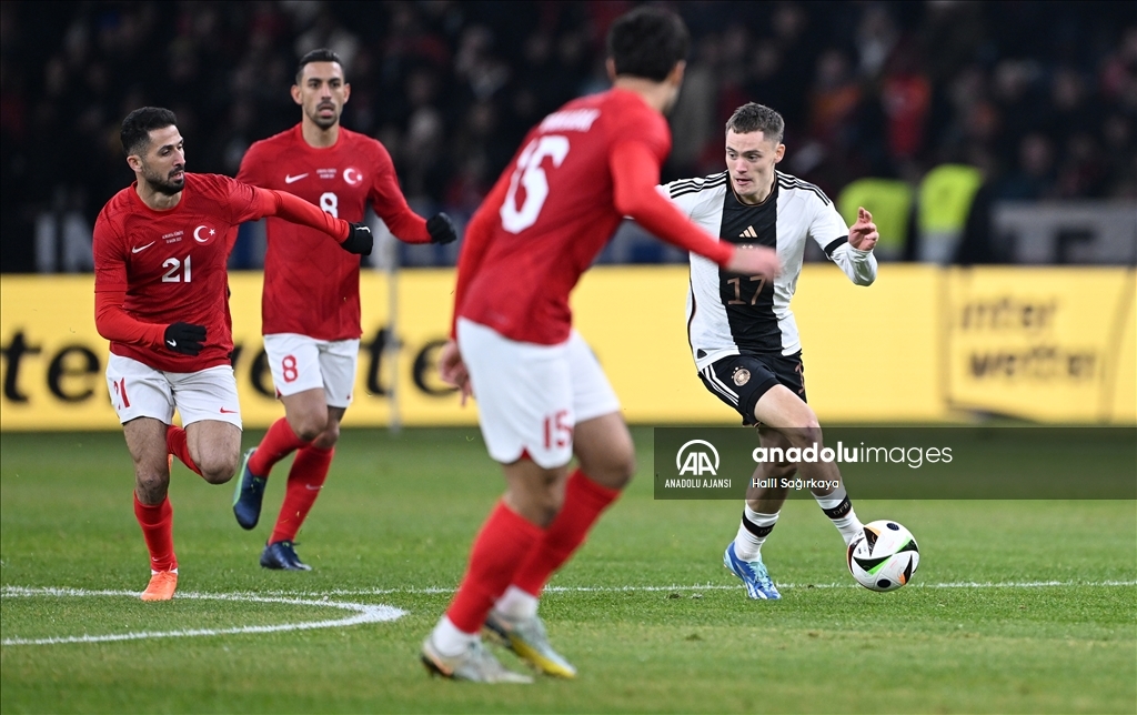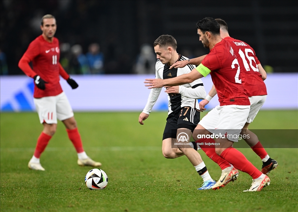 Almanya ile Türkiye, hazırlık maçında Berlin Olimpiyat Stadında karşılaştı. Bir pozisyonda Alman Milli Takım futbolcusu Florian Wirtz (sağda) ile A Milli Takım futbolcuları Emre Akbaba (solda), İrfan Can Kahveci (sol 2) ve Ozan Kabak (sağ 2) mücadele etti. ( Halil Sağırkaya - Anadolu Ajansı )Halil Sağırkaya