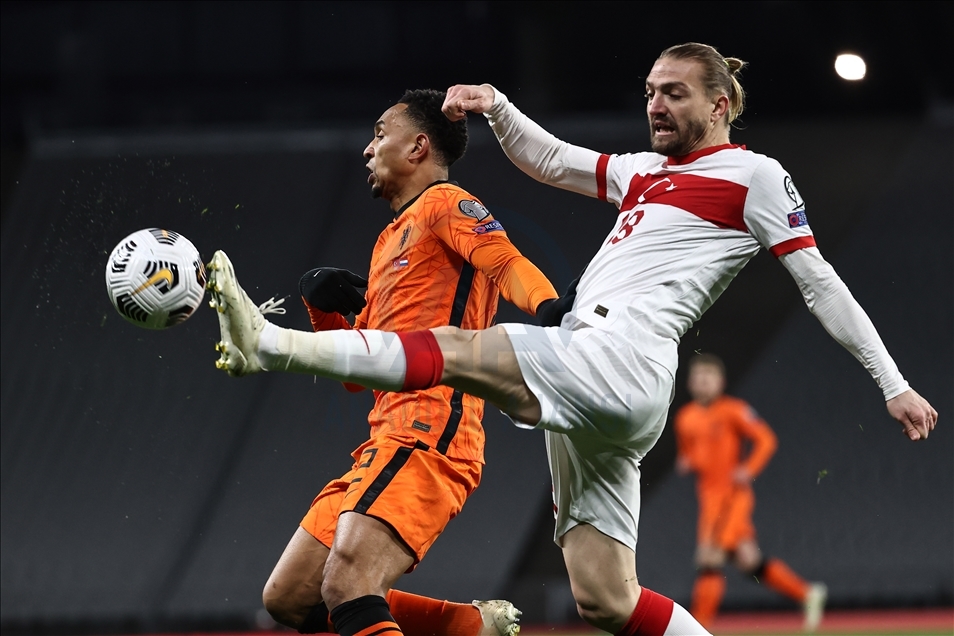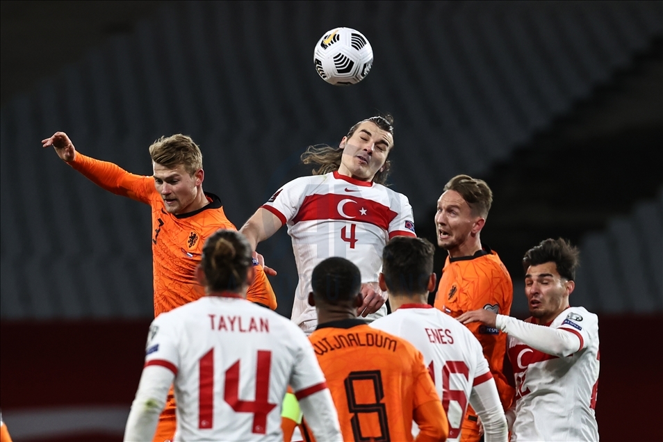 A Milli Futbol Takımı, 2022 FIFA Dünya Kupası Elemeleri G Grubu'nda Hollanda ile Atatürk Olimpiyat Stadı'nda karşılaştı. Bir pozisyonda A Milli Takım oyuncusu Çağlar Söyüncü (4) rakipleriyle mücadele etti. ( Onur Çoban - Anadolu Ajansı )Onur Çoban